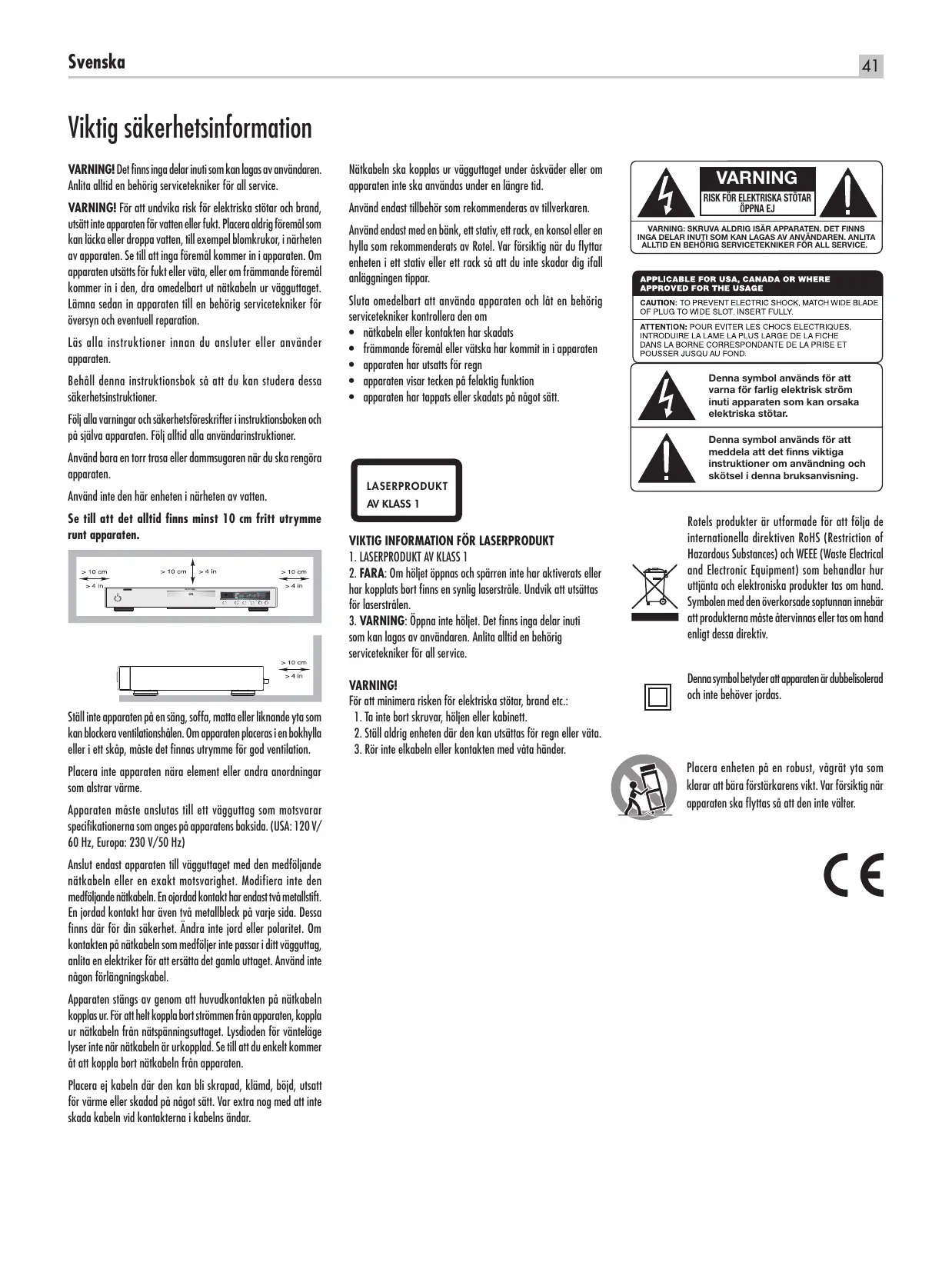 Viktig säkerhetsinformation VARNING! Det finns inga delar inuti som kan lagas av användaren. Anlita alltid en behörig servicetekniker för all service. Nätkabeln ska kopplas ur vägguttaget under åskväder eller om apparaten inte ska användas under en längre tid. VARNING! För att undvika risk för elektriska stötar och brand, utsätt inte apparaten för vatten eller fukt. Placera aldrig föremål som kan läcka eller droppa vatten, till exempel blomkrukor, i närheten av apparaten. Se till att inga föremål kommer in i apparaten. Om apparaten utsätts för fukt eller väta, eller om främmande föremål kommer in i den, dra omedelbart ut nätkabeln ur vägguttaget. Lämna sedan in apparaten till en behörig servicetekniker för översyn och eventuell reparation. Använd endast tillbehör som rekommenderas av tillverkaren. Läs alla instruktioner innan du ansluter eller använder apparaten. Behåll denna instruktionsbok så att du kan studera dessa säkerhetsinstruktioner. Använd endast med en bänk, ett stativ, ett rack, en konsol eller en hylla som rekommenderats av Rotel. Var försiktig när du flyttar enheten i ett stativ eller ett rack så att du inte skadar dig ifall anläggningen tippar. Sluta omedelbart att använda apparaten och låt en behörig servicetekniker kontrollera den om