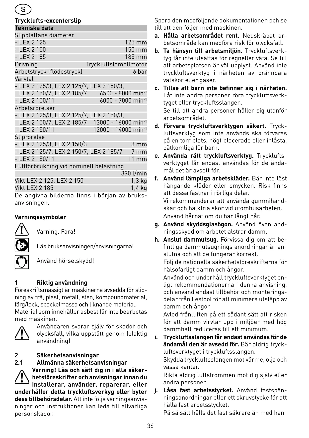 2007 lähtien koko Euroopassa voimassaoleva kemikaaleja koskeva asetus. Käytämme kemikaaleja tuotteidemme valmistuksessa ja olemme tietoisia tiedotusvelvollisuudestamme asiakkaillemme. Olemme avanneet asiakkaitamme varten seuraavan Web-sivuston, josta voit aina katsoa viimeisimmät tiedot tuotteissamme mahdollisesti käytettävistä aineista. REACh til Festool produkter, tilbehør og forbrugsmateriale - Kemikalieloven REACH trådte i kraft i 2007 og er gældende i hele Europa. Toute erreur ou non-respect des indications et consignes de sécurité peut entraîner des blessures graves. Conservez précieusement tous les documents fournis. En cas de cession de la machine, donnezles au nouveau propriétaire. a. Veillez à toujours garder un environnement de travail bien ordonné. Tout désordre dans l’environnement de travail augmente les risques d’accident. b. Tenez compte des facteurs extérieurs. Ne laissez pas d’outils pneumatiques sous la pluie. Veillez à ce que la zone de travail soit bien éclairée. N’utilisez pas d’outils pneumatiques à proximité de liquides ou de gaz inflammables. c. Maintenez les enfants à distance. Ne laissez pas d’autres personnes manipuler l’outil pneumatique ou le flexible à air comprimé. Maintenez les autres personnes à distance de votre poste de travail.