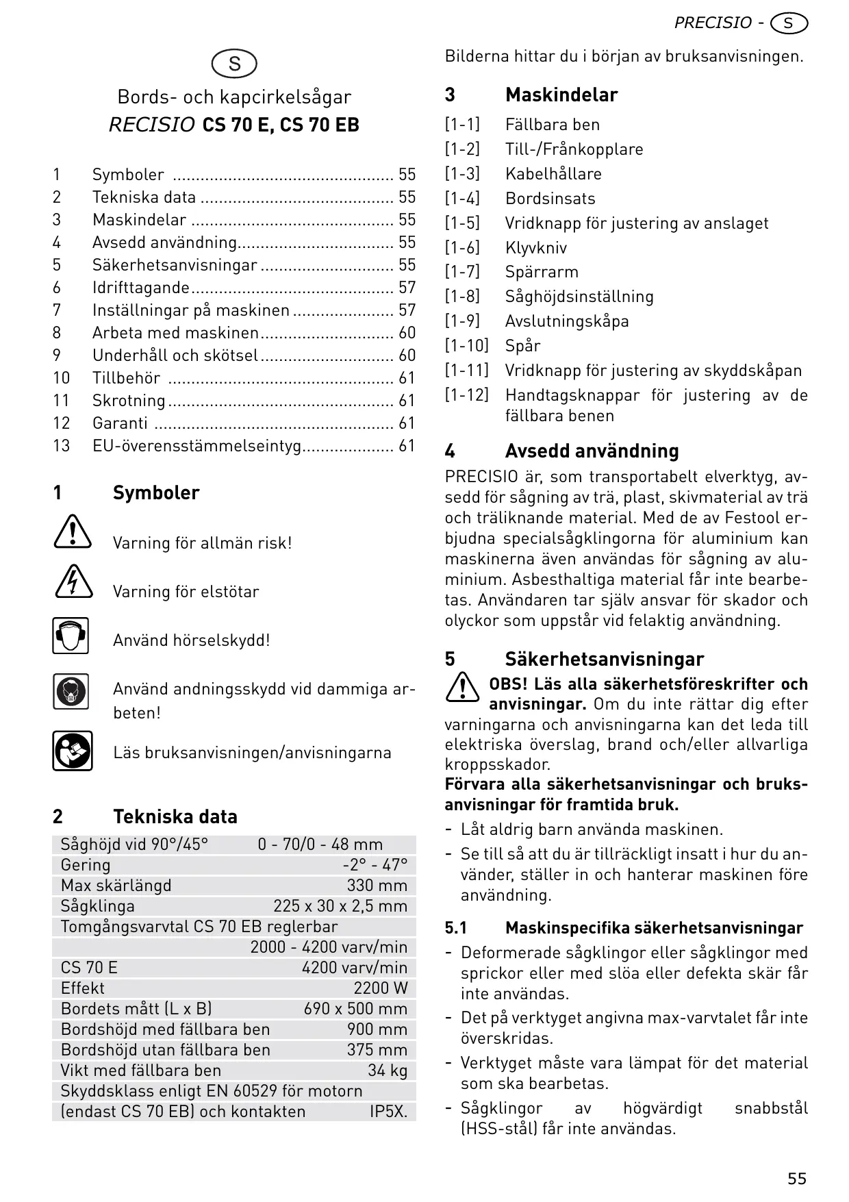 Avsedd användning PRECISIO är, som transportabelt elverktyg, avsedd för sågning av trä, plast, skivmaterial av trä och träliknande material. Med de av Festool erbjudna specialsågklingorna för aluminium kan maskinerna även användas för sågning av aluminium. Asbesthaltiga material får inte bearbetas. Användaren tar själv ansvar för skador och olyckor som uppstår vid felaktig användning. Använd hörselskydd!