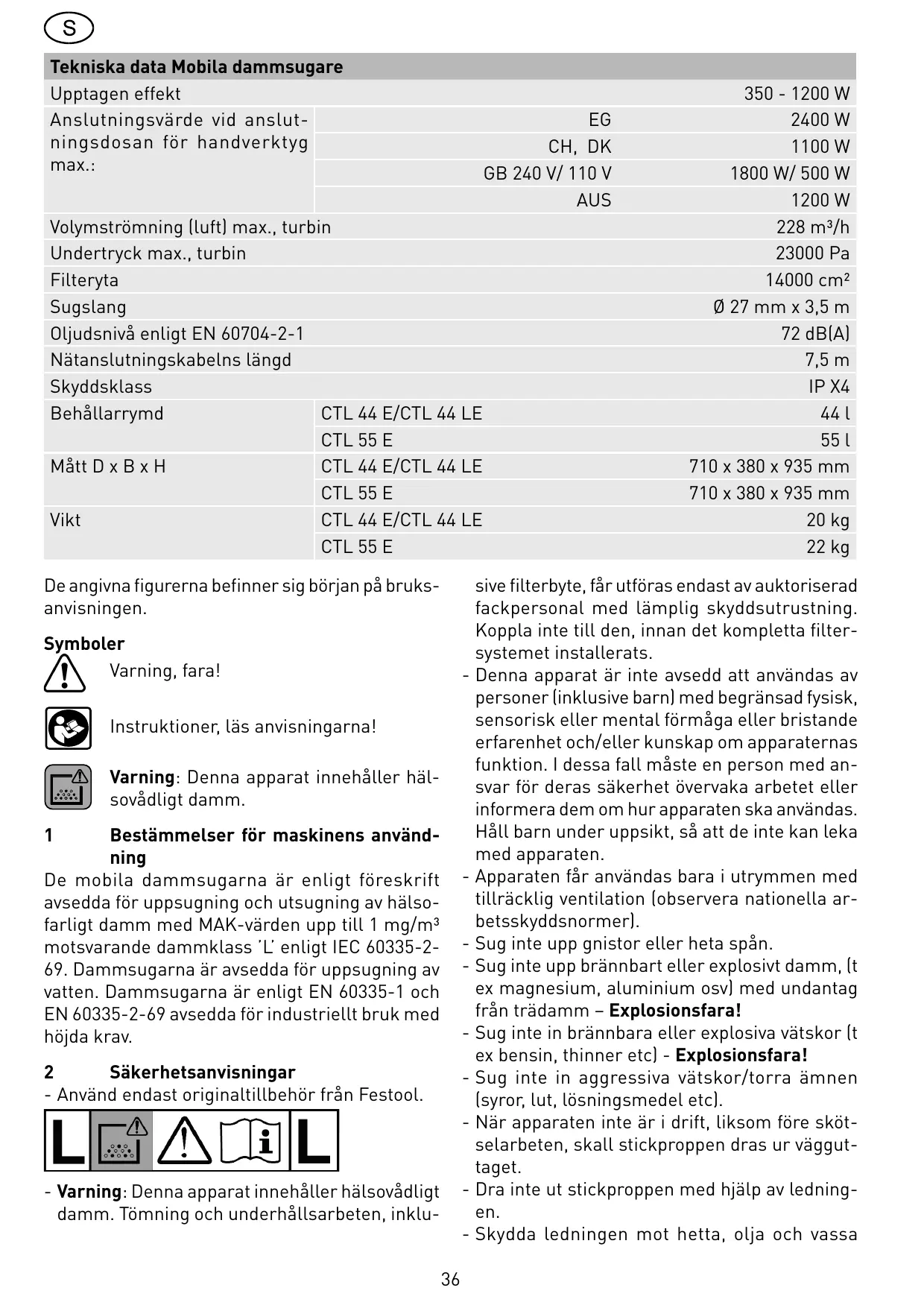 Bestämmelser för maskinens användning De mobila dammsugarna är enligt föreskrift avsedda för uppsugning och utsugning av hälsofarligt damm med MAK-värden upp till 1 mg/m³ motsvarande dammklass ’L’ enligt IEC 60335-269. Dammsugarna är avsedda för uppsugning av vatten. Dammsugarna är enligt EN 60335-1 och EN 60335-2-69 avsedda för industriellt bruk med höjda krav. Säkerhetsanvisningar - Använd endast originaltillbehör från Festool. - Varning: Denna apparat innehåller hälsovådligt damm. Tömning och underhållsarbeten, inklu-