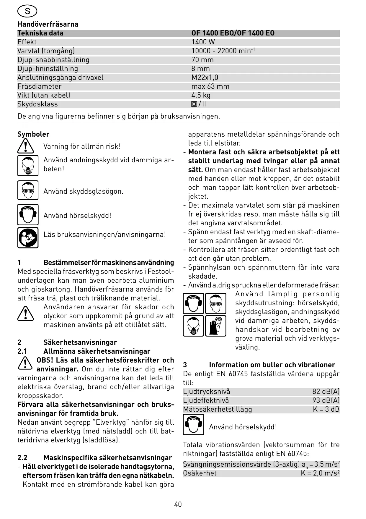 1 Bestämmelserför maskinensanvändning Med speciella fräsverktyg som beskrivs i Festoolunderlagen kan man även bearota aluminium och gipskartong. Handöverfräsarna används for att fräsa trä, plast och träliknande material.