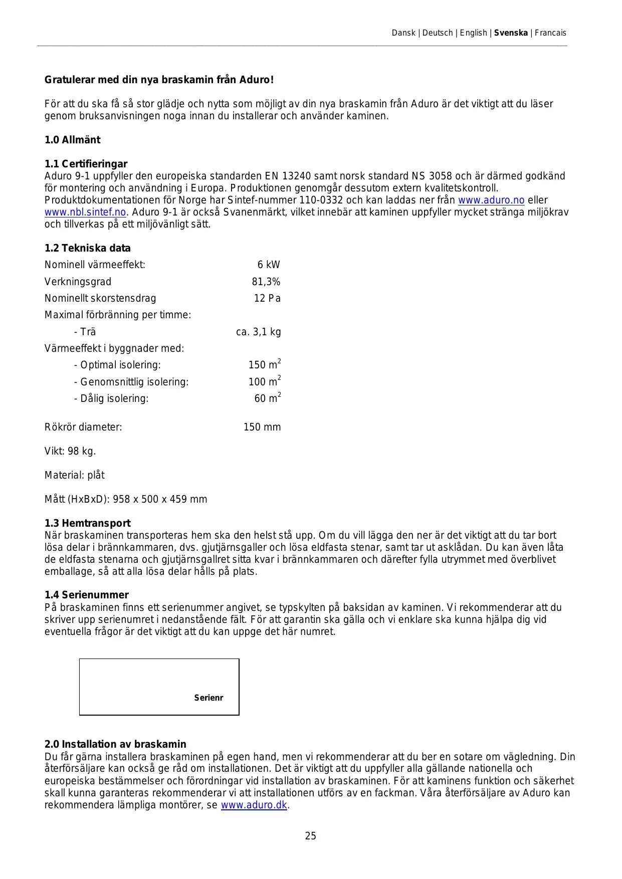 Gratulerar med din nya braskamin från Aduro! För att du ska få så stor glädje och nytta som möjligt av din nya braskamin från Aduro är det viktigt att du läser genom bruksanvisningen noga innan du installerar och använder kaminen.