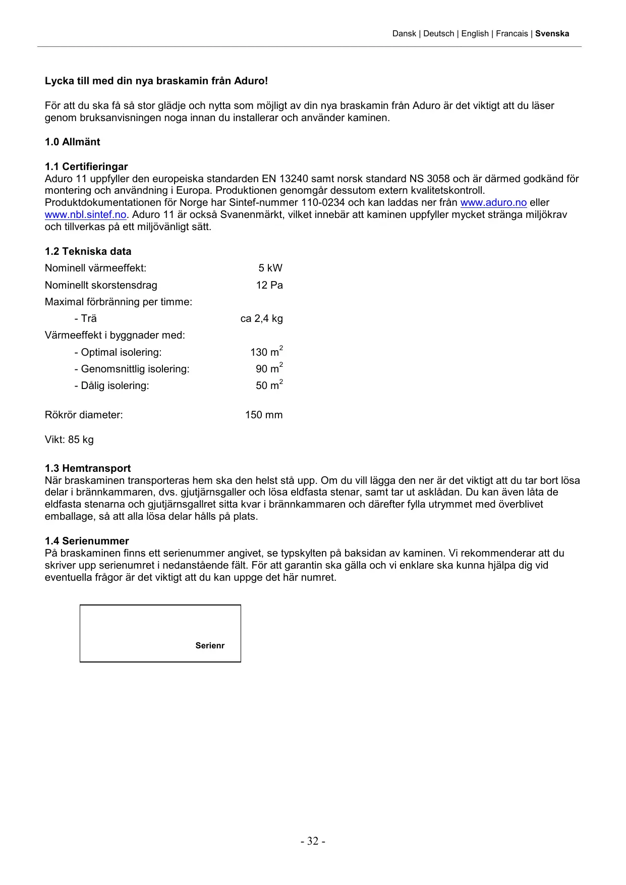 Lycka till med din nya braskamin från Aduro! För att du ska få så stor glädje och nytta som möjligt av din nya braskamin från Aduro är det viktigt att du läser genom bruksanvisningen noga innan du installerar och använder kaminen.