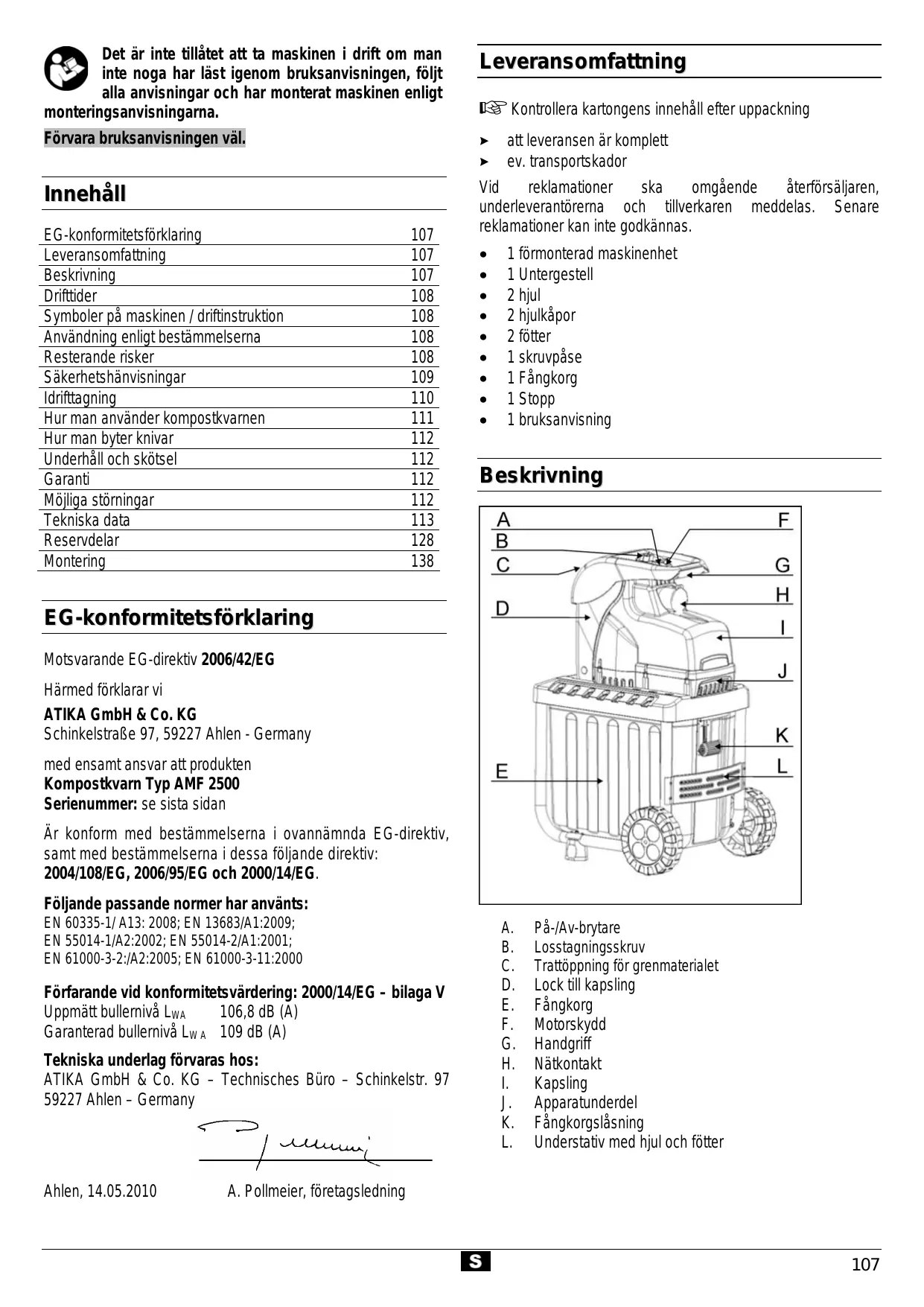 Ar konform med bestämmelserna i ovannämnda EG-direktiv, samt med bestämmelserna i dessa följande direktiv: 2004/108/EG, 2006/95/EG och 2000/14/EG.