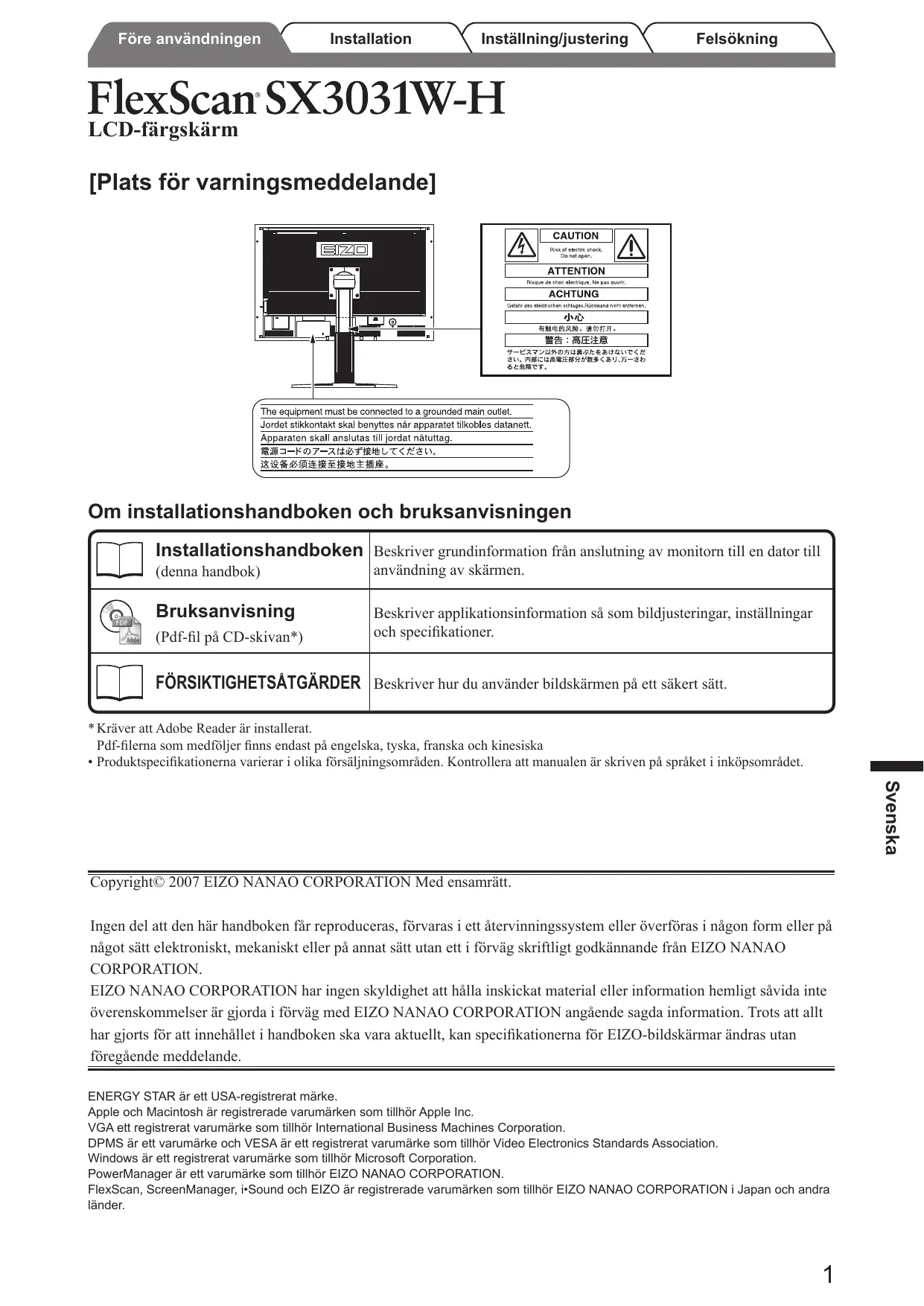 - Kräver att Adobe Reader är installerat. Pdf-filerna som medfôlier finns endast pà engelska, tyska, franska och kinesiska + Produktspecifikationerna varierar i olika fürsäliningsomräden. Kontrollera att manualen är skriven pà spräket i inkôpsomrädet. Copyright© 2007 EIZO NANAO CORPORATION Med ensamrätt. Ingen del att den här handboken fär reproduceras, fürvaras i ett âtervinningssystem eller ôverfôras i nägon form eller pä nägot sätt elektroniskt, mekaniskt eller pà annat sätt utan ett i fôrväg skriftligt godkännande frân EIZO NANAO CORPORATION. EIZO NANAO CORPORATION har ingen skyldighet att hälla inskickat material eller information hemligt sävida inte üverenskommelser är gjorda i frväg med EIZO NANAO CORPORATION angäende sagda information. Trots att allt har gjorts für att innehället i handboken ska vara aktuellt, kan specifikationerna fôr EIZO-bildskärmar ändras utan füregäende meddelande. ENERGY STAR ër ett USA-registrerat märke. Apple och Macintosh är registrerade varumärken som tillhôr Apple Inc. VGA ett registrerat varumärke som tillhër International Business Machines Corporation. DPMS är ett varumärke och VESA ër ett registrerat varumärke som tillhèr Video Electronics Standards Association. Windows är ett registrerat varumärke som tillhôr Microsoft Corporation. PowerManager är ett varumärke som tilhôr EIZO NANAO CORPORATION. FlexScan, ScreenManager, i-Sound och EIZO är registrerade varumärken som tillhôr E1ZO NANAO CORPORATION i Japan och andra länder. D'ÉTENS |