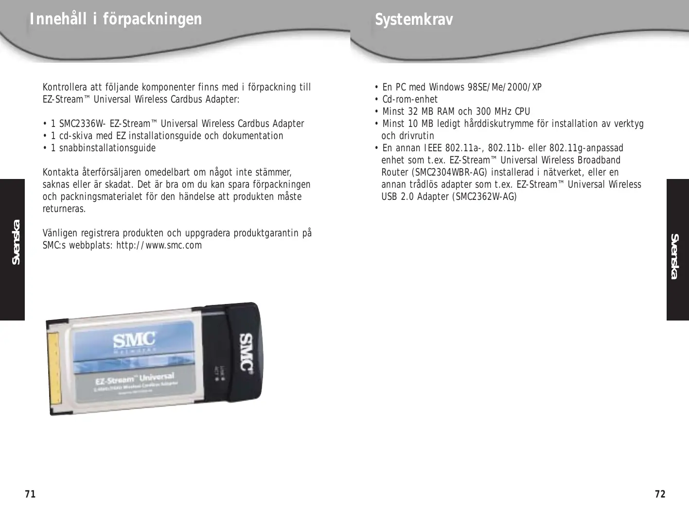 - Minst 32 MB RAM och 300 MHz CPU + 1 SMC2336W- EZ-Stream"” Universal Wireless Cardbus Adapter + Minst 10 MB ledigt härddiskutrymme fôr installation av verktyg + 1 cd-skiva med EZ installationsguide och dokumentation och drivrutin + 1 snabbinstallationsguide + En annan IEEE 802.11a-, 802.11b- eller 802.11g-anpassad enhet som t.ex. EZ-Stream" Universal Wireless Broadband Kontakta äterférsäljaren omedelbart om nägot inte stämmer, Router (SMC2304WBR-AG) installerad i nätverket, eller en saknas eller är skadat. Det är bra om du kan spara fôrpackningen annan trâdlôs adapter som t.ex. EZ-Stream" Universal Wireless och packningsmaterialet fôr den händelse att produkten mâste USB 2.0 Adapter (SMC2362W-AG) returneras. Vänligen registrera produkten och uppgradera produktgarantin pà SMC:s webbplats: http://www.smc.com