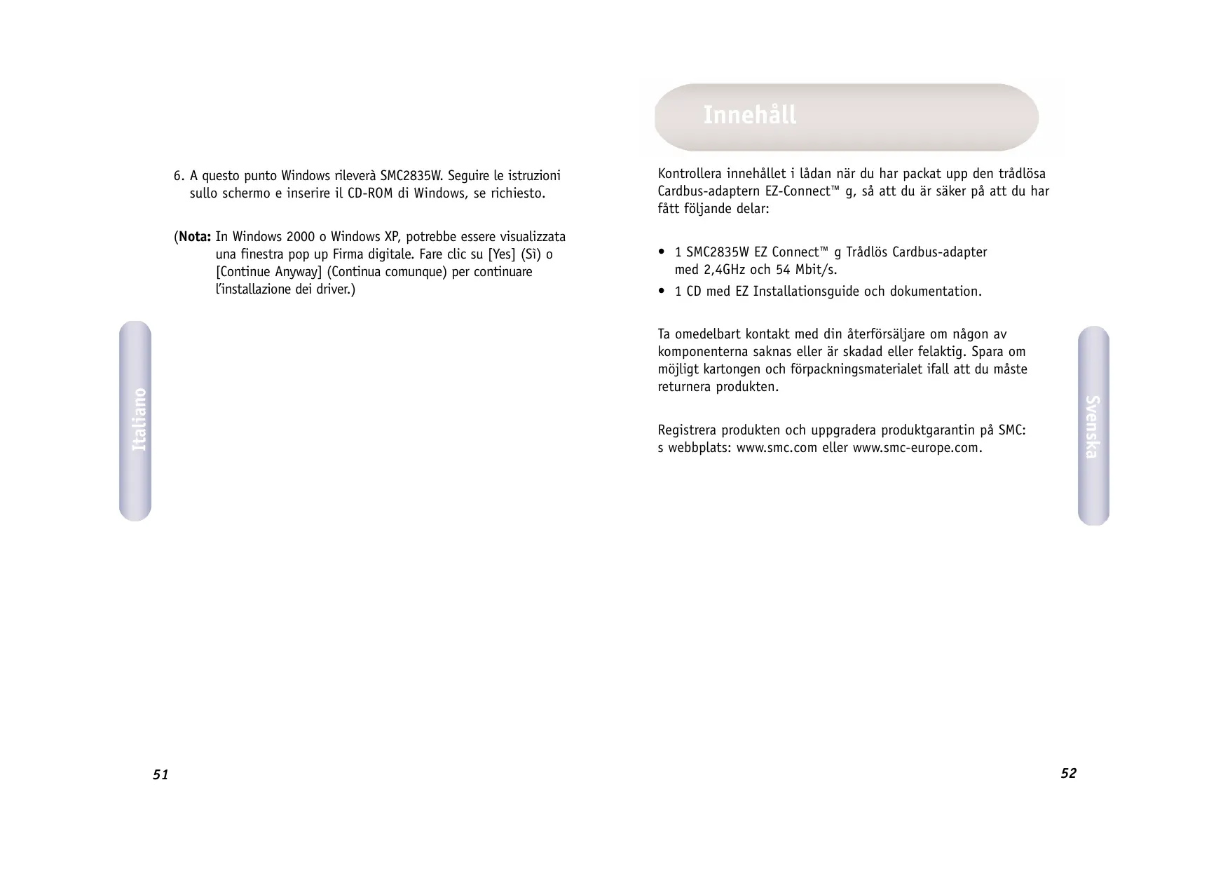 sullo schermo e inserire il CD-ROM di Windows, se richiesto. (Nota: In Windows 2000 o Windows XP, potrebbe essere visualizzata una finestra pop up Firma digitale. Fare clic su [Yes] (Si) o [Continue Anyway] (Continua comunque) per continuare l'installazione dei driver.) Kontrollera innehället i Lädan när du har packat upp den trädlôsa Cardbus-adaptern EZ-Connect" g, sà att du är säker pà att du har fâtt fôljande delar: + 1 SMC2835W EZ Connect" g Trädlôs Cardbus-adapter med 2,4GHz och 54 Mbit/s. + 1 CD med EZ Installationsguide och dokumentation. Ta omedelbart kontakt med din äterfürsäljare om nägon av komponenterna saknas eller är skadad eller felaktig. Spara om môjligt kartongen och fôrpackningsmaterialet ifall att du mäste returnera produkten. Registrera produkten och uppgradera produktgarantin pà SMC: s webbplats: www.smc.com eller www.smc-europe.com.