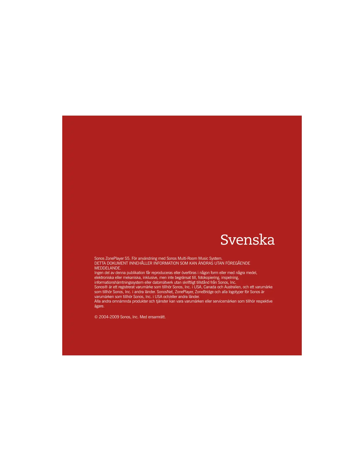 gevulde voorwerpen, zoals vazen, op het apparaat. Svenska Sonos ZonePlayer S5. För användning med Sonos Multi-Room Music System. DETTA DOKUMENT INNEHÅLLER INFORMATION SOM KAN ÄNDRAS UTAN FÖREGÅENDE MEDDELANDE. Ingen del av denna publikation får reproduceras eller överföras i någon form eller med några medel, elektroniska eller mekaniska, inklusive, men inte begränsat till, fotokopiering, inspelning, informationshämtningssystem eller datornätverk utan skriftligt tillstånd från Sonos, Inc. Sonos® är ett registrerat varumärke som tillhör Sonos, Inc. i USA, Canada och Australien, och ett varumärke som tillhör Sonos, Inc. i andra länder. SonosNet, ZonePlayer, ZoneBridge och alla logotyper för Sonos är varumärken som tillhör Sonos, Inc. i USA och/eller andra länder. Alla andra omnämnda produkter och tjänster kan vara varumärken eller servicemärken som tillhör respektive ägare. © 2004-2009 Sonos, Inc. Med ensamrätt. SVENSKA NEDERLANDS DEUTSCH SVENSKA