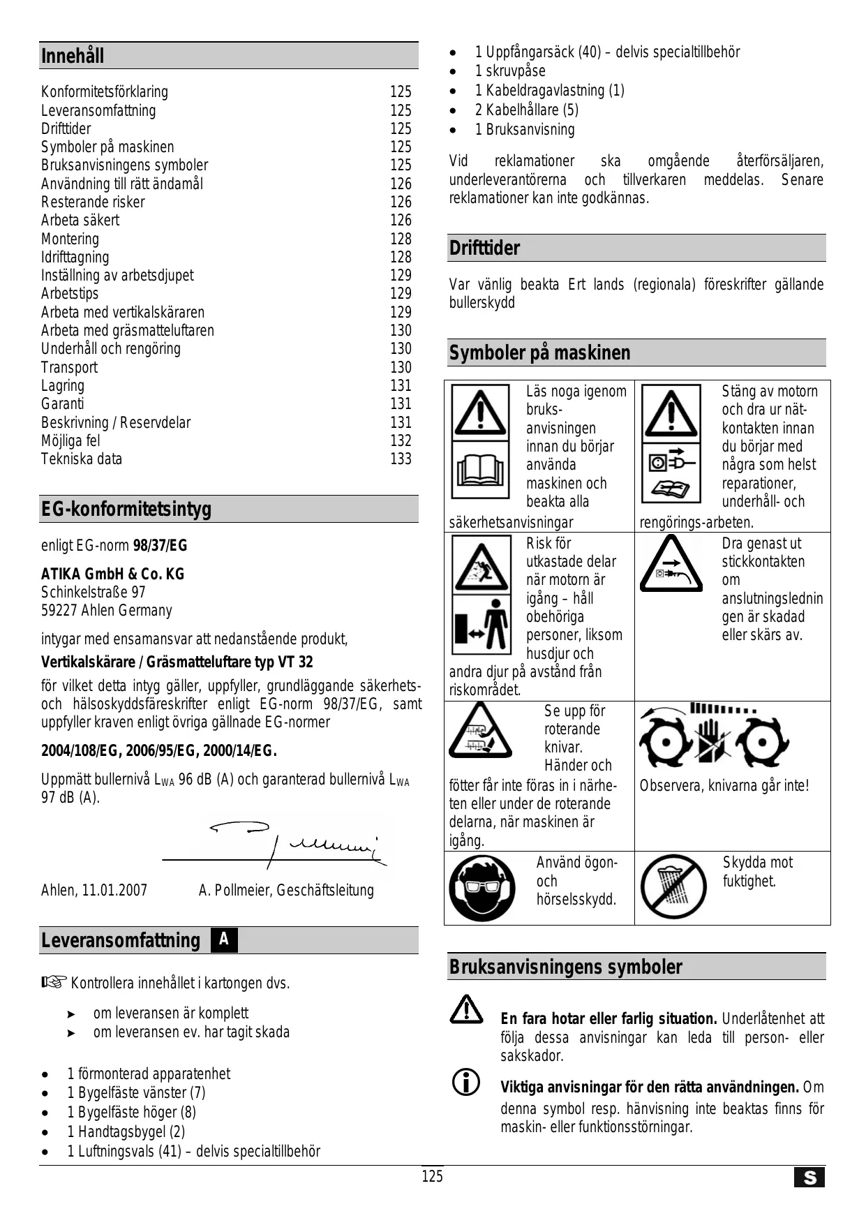 - Egenmaktiga forandringar på vertikalskararen / grasmatteluftaren utesluter allt ansvar.FRAN tillverkaren for alla sorters skador som harigenom kan uppsta.