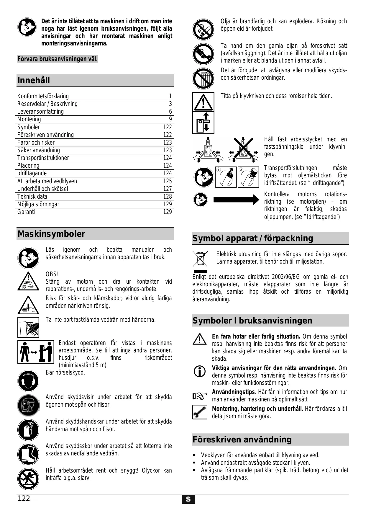 noga har läst igenom bruksanvisningen, fôljt alla anvisningar och har monterat maskinen enligt monteringsanvisningarna. (és Det är inte tillätet att ta maskinen i drift om man inte Fôrvara bruksanvisningen väl. Innehäll Konformitetsfôrklaring 1 Reservdelar / Beskrivning 3 Leveransomfatining 6 Montering 9 Symboler 122 Fôreskriven användning 122 Faror och risker 123 Säker användning 123 Transportinstruktioner 124 Placering 124 Idrifttagande 124 Attarbeta med vedklyven 125 Underhäll och skôtsel 127 Teknisk data 128 Môjliga stôrningar 129 Garanti 129 Maskinsymboler Olja är brandfarlig och kan explodera. Rükning och ôppen eld är forbjudet. Ta hand om den gamla oljan pà füreskrivet sätt (avfallsanläggning). Det àr inte tillätet att hälla ut oljan i marken eller att blanda ut den i annat avfall. Det är fürbjudet att avlägsna eller modifiera skydds- och säkerhetsan-ordningar. Titta pà klyvkniven och dess rôrelser hela tiden. # Häll fast arbetsstycket med en D fastspänningsklo under klyvnin- SANT ge. ü Transportfrslutningen mâste (4 Gi bytas mot oljemätstickan füre idriftsättandet. (se ”Idrifttagande”) Kontrollera motorns rotations- [és ms) rikining (se motorpilen) - om rikiningen ër felaktig, skadas oljepumpen. (se ”Idrifttagande”) +5@0@ Läs igenom och beakta manualen och @ säkerhetsanvisningarna innan apparaten tas i bruk. A Os! Stäng av motom och dra ur kontakten vid EN reparations-, underhälls- och rengürings-arbete. Risk for skär- och klämskador; vidrôr aldrig farliga AN omräden när kniven rôr sig. Li Ta inte bort fastklämda vedträn med händerna. e Endast operatôren fér vistas i maskinens Fr arbetsomräde. Se till att inga andra personer, husdjur o.sv. finns i riskomrädet {minimiavständ 5 m). © Bär hôrselskydd. Använd skyddsvisir under arbetet for att skydda (É] ôgonen mot spän och flisor. Använd skyddshandskar under arbetet fôr att skydda oO händerna mot spän och flisor. Använd skyddsskor under arbetet sà att fôtterna inte Q skadas av nedfallande vedträn. Häll arbetsomrädet rent och snyggt! Olyckor kan inträffa p.g.a. slarv. Symbol apparat / forpackning Elektrisk utrustning fr inte slängas med ôvriga sopor. Lämna apparater, tillbehôr och till miljôstation.
