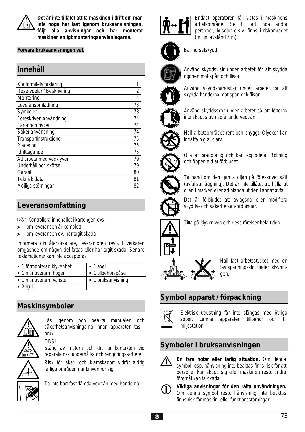 Användningstips. Här får ni information och tips om hur man använder maskinen på optimalt sätt. Montering, hantering och underhåll. Här förklaras allt i detalj som ni måste göra. Föreskriven användning Vedklyven får användas enbart till klyvning av ved. Använd endast rakt avsågade stockar i klyven. Avlägsna främmande partiklar (spik, tråd, betong etc.) ur det trä som skall klyvas. I användning till rätt ändamål ingår också att de av tillverkaren föreskrivna drift-, underhållsoch reparationsbestämmelserna samt de i bruksanvisningen angivna säkerhetsbestämmelserna följs. Varje form av användning utöver detta gäller som användning utanför bestämmelserna. Tillverkaren tar inget ansvar för skador orsakade av användning till ej godkända ändamål. Endast användaren står för hela risken. Tillverkaren tar inget ansvar för skador som uppstått på grund av egenmäktiga förändringar av kompostkvarnen. Maskinen får endast ställas in, användas och underhållas av personer förtrogna med detta och som är informerade om riskerna. Reparationsarbeten får endast utföras av oss eller av oss rekommenderade kundserviceverkstäder. Faror och risker Även om man använder maskinen på föreskrivet sätt och beaktar alla säkerhetsanvisningar finns alltid en viss risk att skada sig på grund av maskinens speciella konstruktion. Risken att skada sig kan man i första hand reducera genom att i detalj följa alla anvisningar i avsnittent "Föreskriven användning" och "Säkerhetsanvisningar", Därutöver bör man vara extra försiktig vad det gäller följande risker: Hänsyn och försiktighet minskar riskerna för person- och sakskador. Om säkerhetsåtgärderna ignoreras kan person- eller sakskador uppstå. Händer och fingrar kan skadas av den rörliga kniven på grund av oaktsamhet, försummelse att följa säkerhetsbestämmelserna samt icke ändamålsenlig användning. Risk att skada sig genom ström om man använder bristfälliga elektriska anslutningsledningar. Risk att skadas sig om man vidrör spänningsförande delar om elektriska komponenter har öppnats. Dessutom kan det alltid finnas en viss risk att skada sig även om denna risk inte är direkt uppenbar. Säker användning Läs noga igenom och beakta anvisningarna nedan samt alla tillämpliga nationella säkerhetsbestämmelser