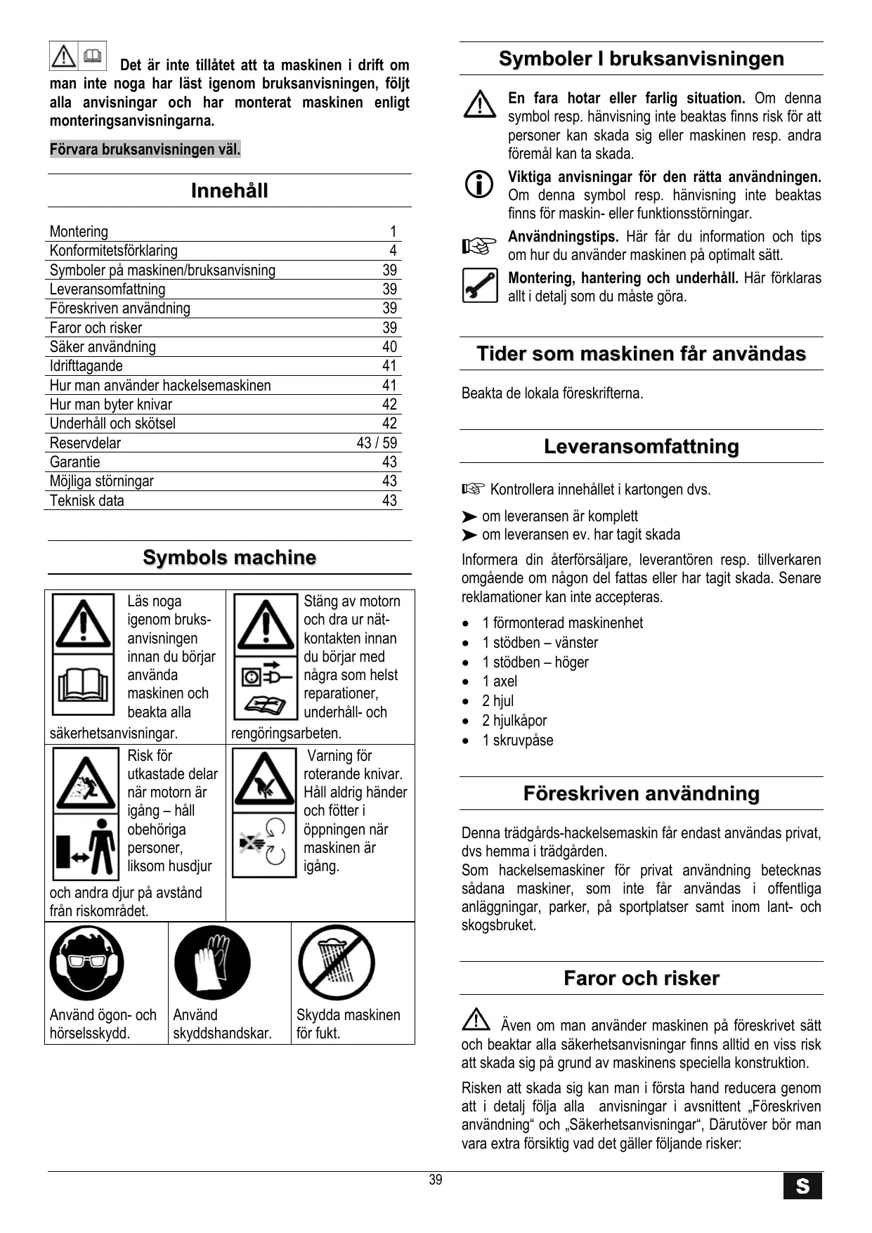 Viktiga anvisningar for den rätta användningen. Omenna symbol resp. hänvisning inte beaktas finns for maskin- eller Funktionstörningar.