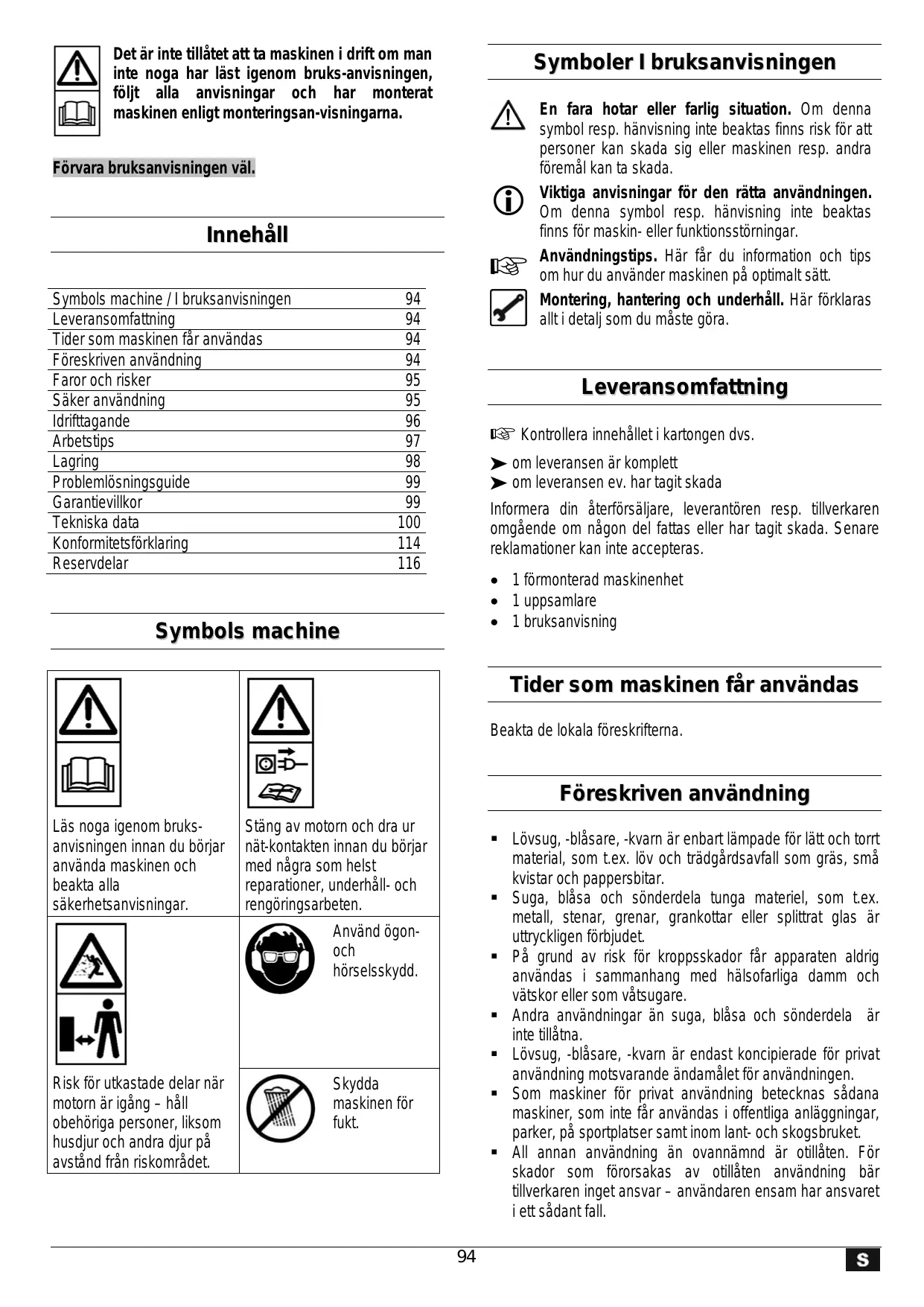 Symbols machine / I bruksanvisningen Leveransomfattning Tider som maskinen får användas Föreskriven användning Faror och risker Säker användning Idrifttagande Arbetstips Lagring Problemlösningsguide Garantievillkor Tekniska data Konformitetsförklaring Reservdelar