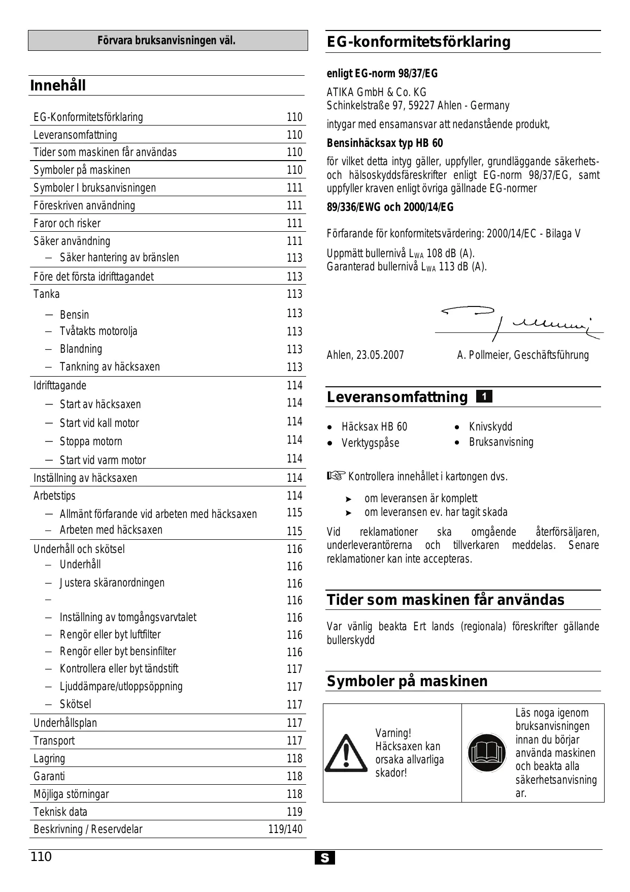 | Varning! Häcksaxen kan orsaka allvarliga skador! | Läs nogaigenom bruksanvisingen innan du böjar använda maskinen och beakta alla säkerhetsanvising ar. |