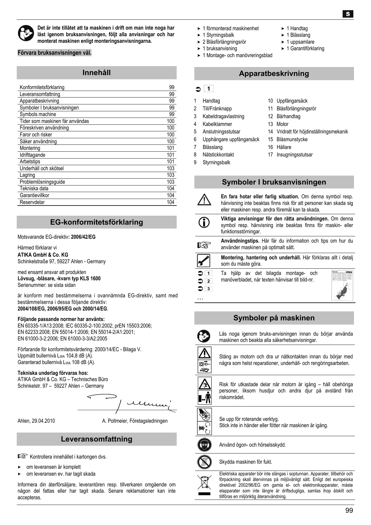 Motsvarande EG-direktiv: 2006/42/EG Härmed fürklarar vi ATIKA GmbH & Co. KG SchinkelstraRe 97, 59227 Ahlen - Germany