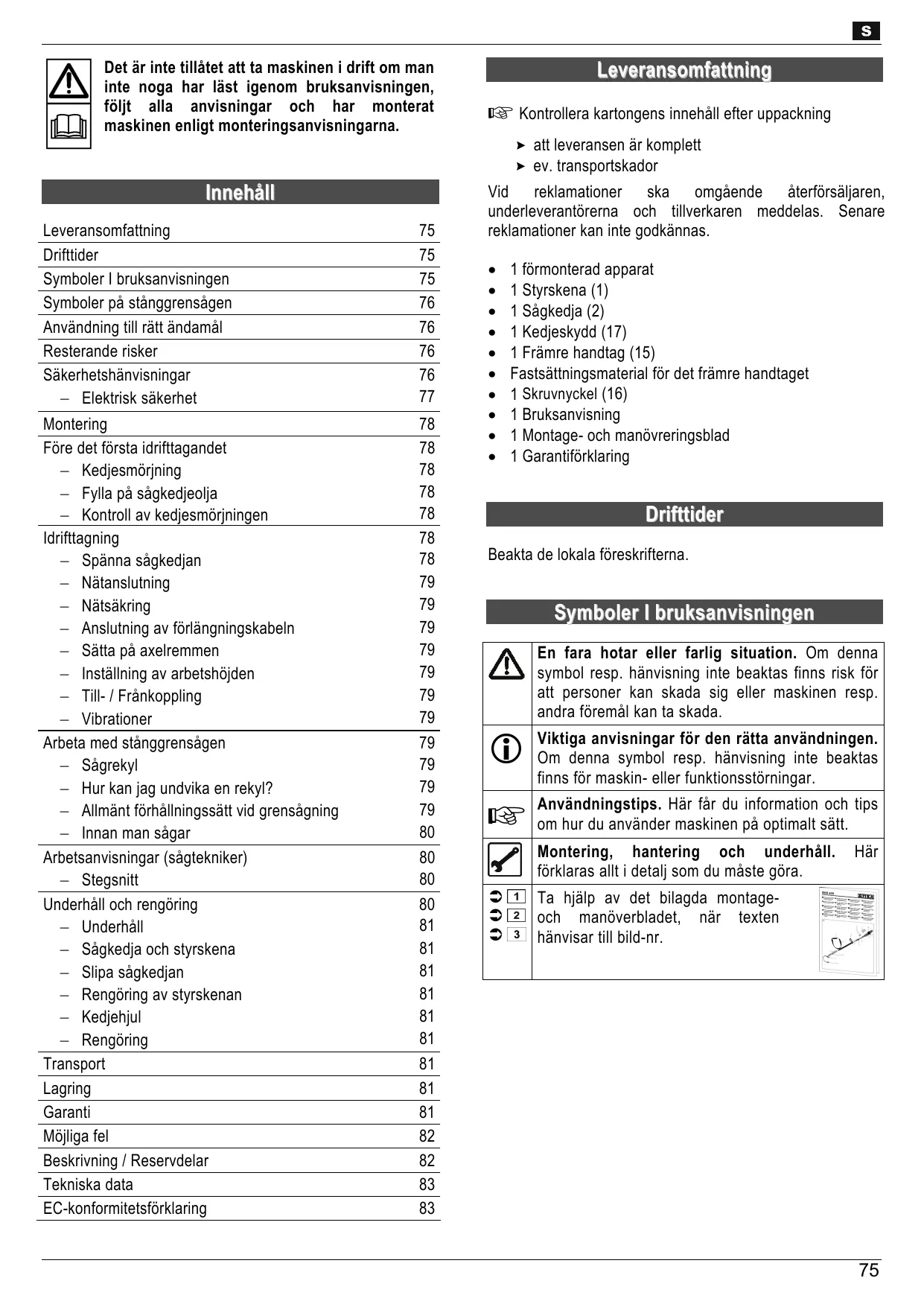Symboler | bruksanvisningen 75 ° Symboler pà stnggrensägen 76 : Användning till râtt ändamäl 76 . Resterande risker 76 . Säkerhetshänvisningar 76 .