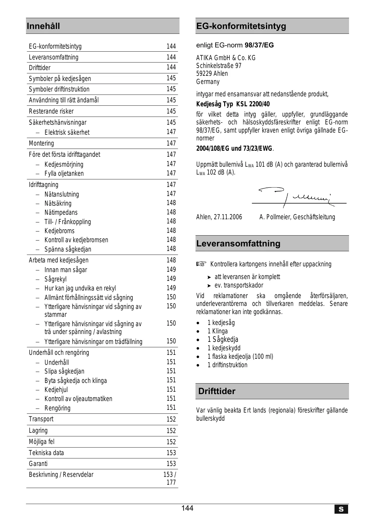 EG-konformitetsintyg 144 enligt EG-norm 98/37/EG Leveransomfattning 144 ATIKA GmbH & Co. KG Drifttider 144 Schinkelstra&e 97 ya dacs 59229 Ahlk Symboler pà kedjesägen 145 Germany en i i 145 k Symboler drifinstukion = intygar med ensamansvar att nedanstaende produkt, Användning ül râtt ändamäl 145 Kedjesäg Typ KSL 2200/40 Resterande risker 145 fôr vilket detta intyg gäller, uppfyller, grundläggande Säkerhetshänvisningar 145 säkerhets- och hälsoskyddsfäreskrifter enligt EG-norm _ Elektrisk säkerhet 147 98/37/ÈG, samt uppfyller kraven enligt ôvriga gällnade EG- normer Monteri 147 ® 9 pe 2004/108/E G und 73/23/EWG. Fôre det forsta idrifttagandet 147 — Kedjesmürining 147 Uppmätt bullernivä Lwa 101 dB (A) och garanterad bullemivà — Fylla oljetanken 147 Lua 102 dB (A). Idrifttagning 147 = Nätenslunin 147 TT SENS urnIng / res, — Nätsäkring 148 — Nâtimpedans 148 : . = Tilk/Frénkoppling 148 Ahlen, 27.11.2006 À. Pollmeier, Geschäftsleitung — Kedjebroms 148 — Kontroll av kedjebromsen 148 Leveransomfattning — Spänna sägkedjan 148 Arbeta med kedeségen 148 1 Kontrollera kartongens innehäll efter uppackning —_Innan man sägar 149 — Sägrekyl 149 > attleveransen är komplett — Hur kan jag undvika en rekyl 149 > ev. transportskador — Allmänt férhällningssätt vid sägning 150 Vid_ reklamationer ska omgâäende âterfürsäljaren, = Ytterligare hänvisningar vid sägning av 150 underleverantôrema och tillverkaren meddelas. Senare stammar reklamationer kan inte godkännas. — Ytterligare hänvisningar vid sägning av 150 ° _1kedjesäg trà under spänning / avlastning . 1 Klinga | —_ Ytteigare hänvisningar om trädfällning 150 + 1Sägkedja Underhäll och = TI e lkedjeskydd Nora” on rengorng °__ 1 flaska kedjeolja (100 mi) — Underhäll 151 1 driftinstruktion — Slipa sägkedjan 151 — _ Byta sägkedja och klinga 151 — Kedjehjul 151 Drifttider — _Kontroll av oljeautomatiken 151 — _Rengôüring 151 Var vänlig beakta Ert lands (regionala) fôreskrifter gällande Transport 152 bullerskydd Lagring 152 Môlga fel 152 Tekniska data 153 Garanti 153 Beskrivning / Reservdelar 153/ 177
