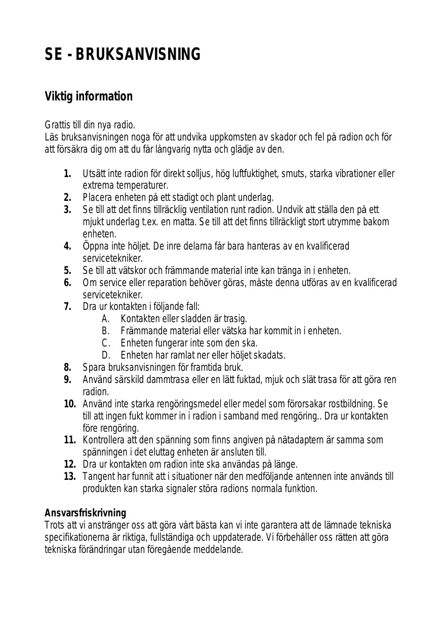 Viktig information Grattis till din nya radio. Läs bruksanvisningen noga för att undvika uppkomsten av skador och fel på radion och för att försäkra dig om att du får långvarig nytta och glädje av den.