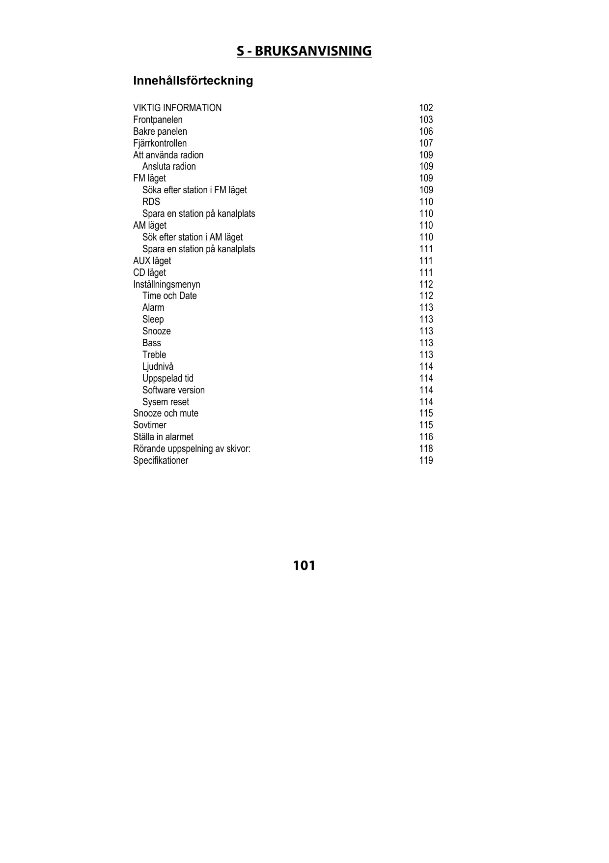 Innehållsförteckning VIKTIG INFORMATION Frontpanelen Bakre panelen Fjärrkontrollen Att använda radion Ansluta radion FM läget Söka efter station i FM läget RDS Spara en station på kanalplats AM läget Sök efter station i AM läget Spara en station på kanalplats AUX läget CD läget Inställningsmenyn Time och Date Alarm Sleep Snooze Bass Treble Ljudnivå Uppspelad tid Software version Sysem reset Snooze och mute Sovtimer Ställa in alarmet Rörande uppspelning av skivor: Specifikationer