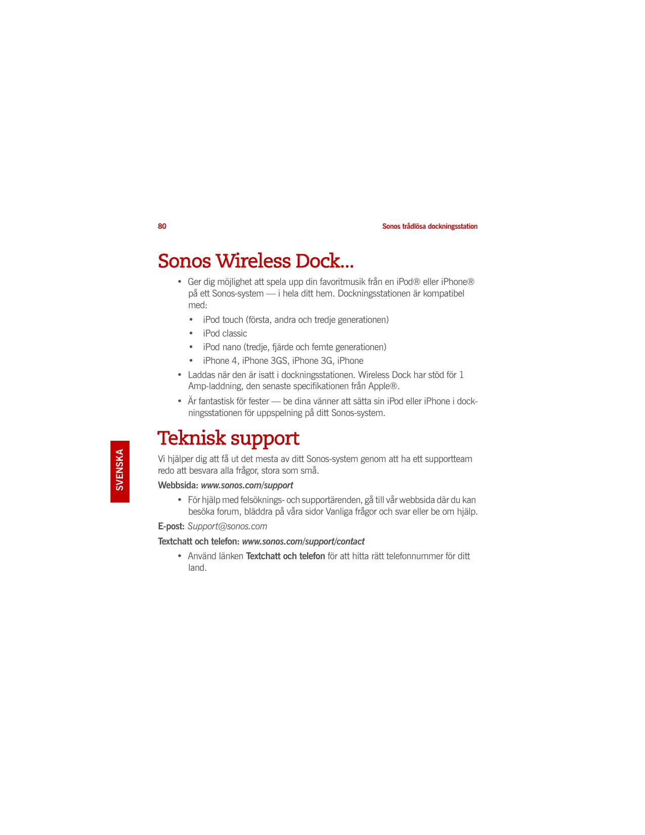 - Är fantastisk för fester — be dina vänner att sätta sin iPod eller iPhone i dockningsstationen för uppspelning på ditt Sonos-system. Teknisk support Vi hjälper dig att få ut det mesta av ditt Sonos-system genom att ha ett supportteam redo att besvara alla frågor, stora som små. Webbsida: www.sonos.com/support