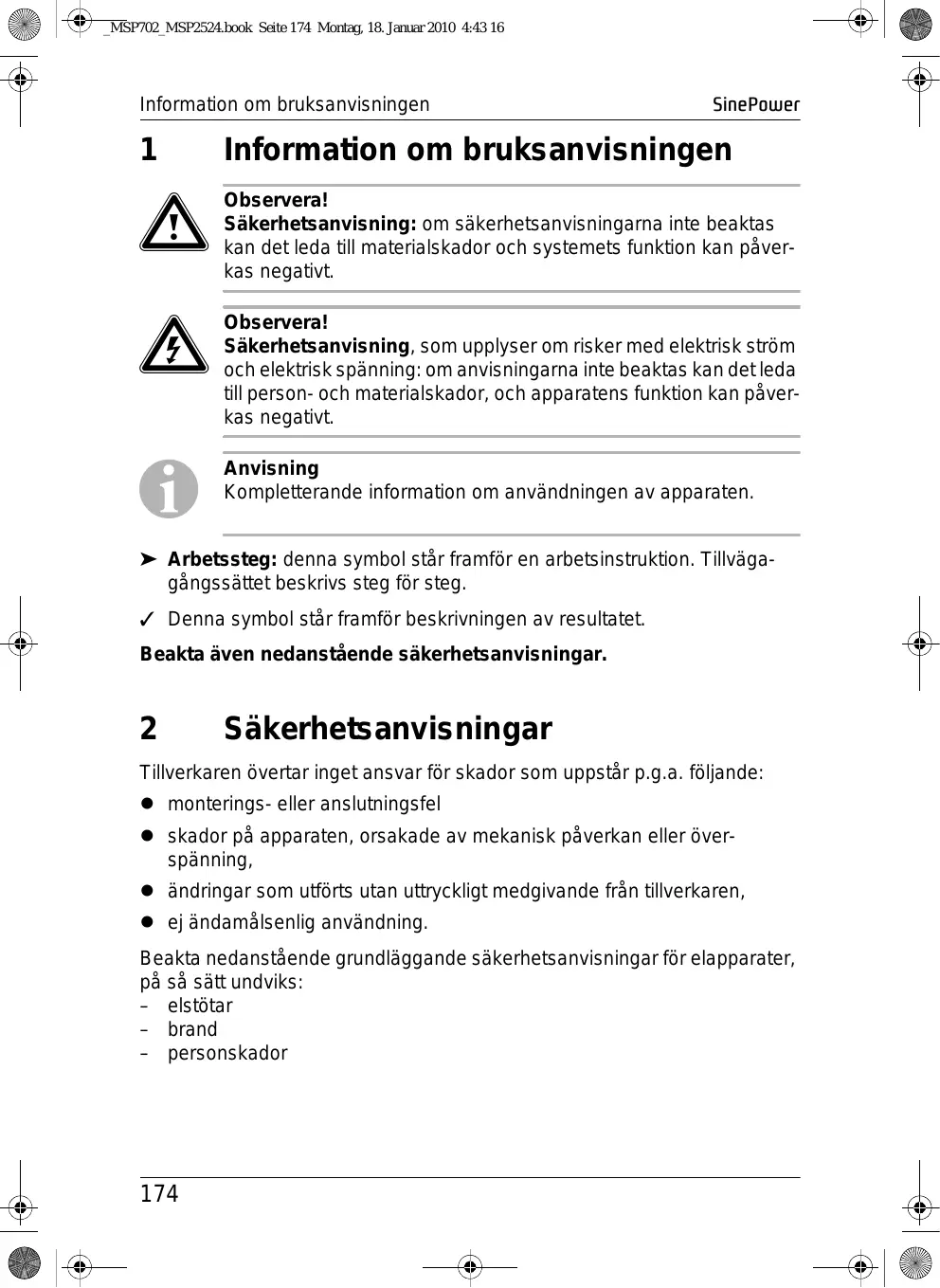 Kapitlet „Ansluta växelriktaren“ auf Seite 184 riktar sig endast till behörigt fackfolk som har kännedom om relevanta VDE-standarder/direktiv. Alla andra kapitel riktar sig även till ägaren/användaren av apparaten.