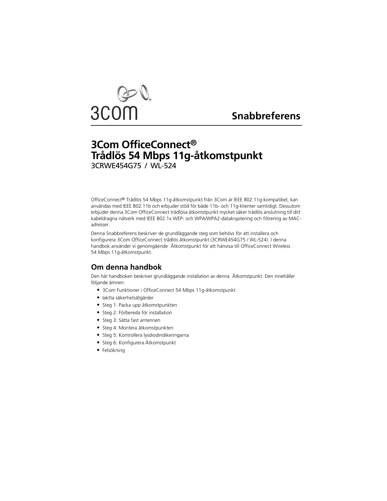 Téléchargez la notice de votre Trådlös router au format PDF gratuitement ! Retrouvez votre notice OFFICECONNECT 3CRWE454G75 - 3COM et reprennez votre appareil électronique en main. Sur cette page sont publiés tous les documents nécessaires à l'utilisation de votre appareil OFFICECONNECT 3CRWE454G75 de la marque 3COM.