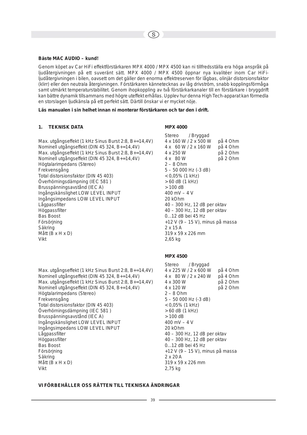 TEKNISK DATA MPX 4000 Max. utgångseffekt (1 kHz Sinus Burst 2:8, B+=14,4V) Nominell utgångseffekt (DIN 45 324, B+=14,4V) Max. utgångseffekt (1 kHz Sinus Burst 2:8, B+=14,4V) Nominell utgångseffekt (DIN 45 324, B+=14,4V) Högtalarimpedans (Stereo) Frekvensgång Total distorsionsfaktor (DIN 45 403) Överhörningsdämpning (IEC 581 ) Brusspänningsavstånd (IEC A) Ingångskänslighet LOW LEVEL INPUT Ingångsimpedans LOW LEVEL INPUT Lågpassfilter Högpassfilter Bas Boost Försörjning Säkring Mått (B x H x D) Vikt Stereo / Bryggad 4 x 160 W / 2 x 500 W på 4 Ohm 4 x 60 W / 2 x 160 W på 4 Ohm 4 x 250 W på 2 Ohm 4 x 80 W på 2 Ohm 2 – 8 Ohm 5 – 50 000 Hz (-3 dB) < 0,05% (1 kHz) > 60 dB (1 kHz) > 100 dB 400 mV – 4 V 20 kOhm 40 – 300 Hz, 12 dB per oktav 40 – 300 Hz, 12 dB per oktav 0...12 dB bei 45 Hz +12 V (9 – 15 V), minus på massa 2 x 15 A 319 x 59 x 226 mm 2,65 kg MPX 4500 Max. utgångseffekt (1 kHz Sinus Burst 2:8, B+=14,4V) Nominell utgångseffekt (DIN 45 324, B+=14,4V) Max. utgångseffekt (1 kHz Sinus Burst 2:8, B+=14,4V) Nominell utgångseffekt (DIN 45 324, B+=14,4V) Högtalarimpedans (Stereo) Frekvensgång Total distorsionsfaktor (DIN 45 403) Överhörningsdämpning (IEC 581 ) Brusspänningsavstånd (IEC A) Ingångskänslighet LOW LEVEL INPUT Ingångsimpedans LOW LEVEL INPUT Lågpassfilter Högpassfilter Bas Boost Försörjning Säkring Mått (B x H x D) Vikt Stereo / Bryggad 4 x 225 W / 2 x 600 W på 4 Ohm 4 x 80 W / 2 x 240 W på 4 Ohm 4 x 300 W på 2 Ohm 4 x 120 W på 2 Ohm 2 – 8 Ohm 5 – 50 000 Hz (-3 dB) < 0,05% (1 kHz) > 60 dB (1 kHz) > 100 dB 400 mV – 4 V 20 kOhm 40 – 300 Hz, 12 dB per oktav 40 – 300 Hz, 12 dB per oktav 0...12 dB bei 45 Hz +12 V (9 – 15 V), minus på massa 2 x 20 A 319 x 59 x 226 mm 2,75 kg VI FÖRBEHÅLLER OSS RÄTTEN TILL TEKNISKA ÄNDRINGAR
