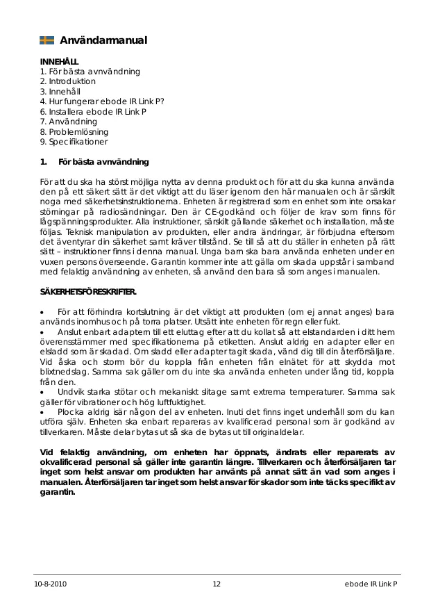 Vid felaktig använding, om encheten har öppnats, andrats eller reparerats av okvalliciferad personal sögäller inte garantin langre. Tillverkaren och äterfalsjaren tar inget som helst ansvar omprodukten har används på annat sättän vad som anges i manuale. Återfalsjaren tar inget som helst ansvar for skador som inte tacks spektifikt av garantin.