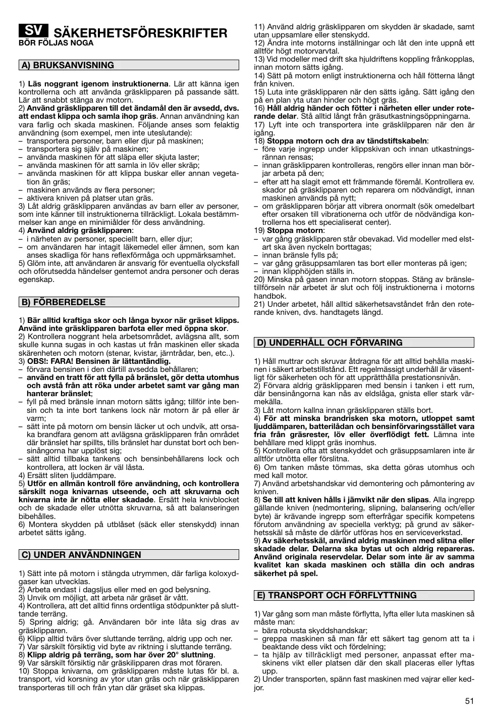 1) Toujours porter des chaussures résistantes et des pantalons longs pendant la tonte. Ne pas utiliser le matériel lorsque l’on est pieds nus ou en sandales. 2) Inspecter minutieusement toute la zone à tondre et éliminer tout objet étranger qui pourrait être projeté par la machine ou endommager l'ensemble de coupe et le moteur (pierres, morceaux de bois, fils de fer, os, etc..). 3) ATTENTION: DANGER! L’essence est hautement inflammable: – conserver le carburant dans des récipients spécialement prévus à cet effet; – faire le plein à l’aide d’un entonnoir, à l’extérieur uniquement et ne pas fumer pendant cette opération ou pendant toute manipulation de carburant; – ajouter de l’essence avant de démarrer le moteur et ne jamais enlever le bouchon du réservoir de carburant ou faire le plein lorsque le moteur est en fonctionnement ou tant qu’il est encore chaud; – ne pas démarrer le moteur si de l’essence a été répandue. Éloigner la tondeuse de la zone où le carburant a été renversé et ne provoquer aucune inflammation tant que le carburant ne s’est pas évaporé et que les vapeurs ne se sont pas dissipées; – remettre et serrer correctement les bouchons du réservoir et du récipient. 4) Remplacer les silencieux d’échappement défectueux. 5) Avant l’utilisation, toujours procéder à une vérification générale et en particulier de l’aspect des lames, des vis de fixation et de l’ensemble de coupe pour s’assurer qu’ils ne sont ni usés ni endommagés. Remplacer les lames et les vis endommagées ou usées par lots complets pour préserver le bon équilibrage. 6) Avant de commencer le travail, monter les protections (sac et déflecteur).