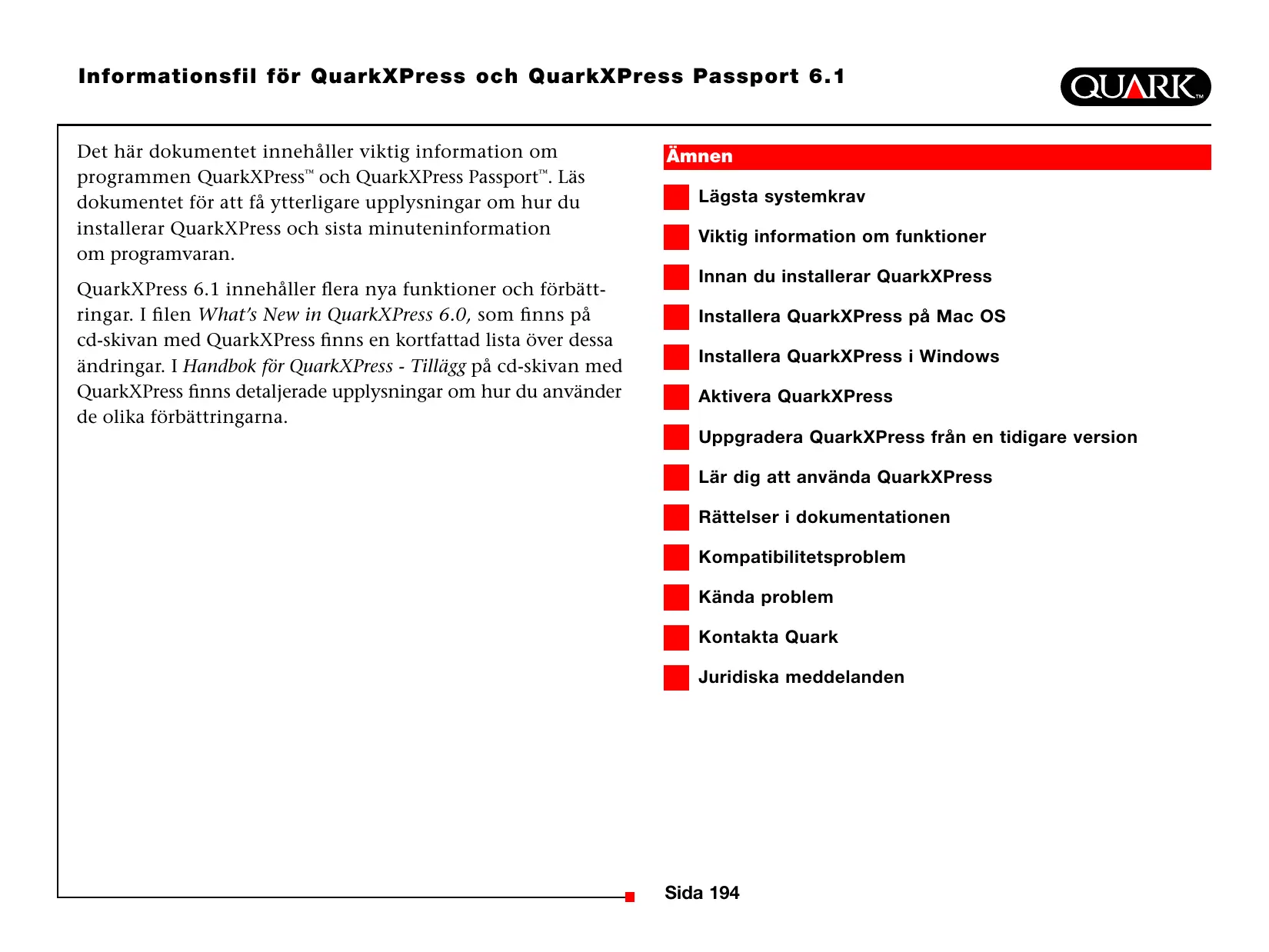 Téléchargez la notice de votre Desktop publishing-programvara au format PDF gratuitement ! Retrouvez votre notice XPRESS PASSPORT 6.1 - QUARK et reprennez votre appareil électronique en main. Sur cette page sont publiés tous les documents nécessaires à l'utilisation de votre appareil XPRESS PASSPORT 6.1 de la marque QUARK.