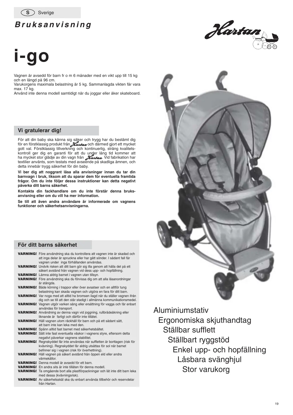 Sverige Bruksanvisning i-go Vagnen är avsedd för barn fr o m 6 månader med en vikt upp till 15 kg och en längd på 96 cm. Varukorgens maximala belastning är 5 kg. Sammanlagda vikten får vara max. 17 kg. Använd inte denna modell samtidigt när du joggar eller åker skateboard. Vi gratulerar dig! För att din baby ska känna sig säker och trygg har du bestämt dig för en förstklassig produkt från och därmed gjort ett mycket gott val. Förstklassig tillverkning och kontinuerlig, sträng kvalitetskontroll ger dig en garanti för att du under lång tid kommer att ha mycket stor glädje av din vagn från . Vid fabrikation har textilier använts, som testats med avseende på skadliga ämnen, och detta innebär trygg säkerhet för din baby. Vi ber dig att noggrant läsa alla anvisningar innan du tar din barnvagn i bruk, liksom att du sparar dem för eventuella framtida frågor. Om du inte följer dessa instruktioner kan detta negativt påverka ditt barns säkerhet. Kontakta din fackhandlare om du inte förstår denna bruksanvisning eller om du vill ha mer information. Se till att även andra användare är informerade om vagnens funktioner och säkerhetsanvisningarna. För ditt barns säkerhet VARNING! Före användning ska du kontrollera att vagnen inte är skadad och att inga delar är spruckna eller har gått sönder. I sådant fall får vagnen under inga förhållanden användas. VARNING! Undvik risken att ditt barn gör sig illa genom att hålla det på ett säkert avstånd från vagnen vid dess upp- och hopfällning. VARNING! Lämna aldrig barnet i vagnen utan tillsyn. VARNING! Före användning ska du förvissa dig om att alla låsanordningar är stängda. VARNING! Både körning i trappor eller över avsatser och en alltför tung belastning kan skada vagnen och utgöra en fara för ditt barn. VARNING! Var noga med att alltid ha bromsen ilagd när du ställer vagnen ifrån dig och se till att den står stadigt i allmänna kommunikationsmedel. VARNING! Vagnen utgör varken säng eller ersättning för vagga och får enbart användas för transport. VARNING! Användning av denna vagn vid joggning, rullbrädeåkning eller liknande är farligt och därför inte tillåtet. VARNING! Håll vagnen utom räckhåll för barn och på ett sådant sätt, att barn inte kan leka med den. VARNING! Spänn alltid fast barnet med säkerhetsbältet. VARNING! Sätt inte fast eventuella väskor i vagnens styre, eftersom detta negativt påverkar vagnens stabilitet. VARNING! Regnskyddet får inte användas när suffletten är borttagen (risk för kvävning). Regnskyddet får aldrig utsättas för sol när barnet befinner sig i vagnen (risk för överhettning). VARNING! Håll vagnen på säkert avstånd från öppen eld eller andra värmekällor. VARNING! Denna modell är avsedd för ett barn. VARNING! En andra sits är inte tillåten för denna modell. VARNING! Ta omgående bort alla plastförpackningar och låt inte ditt barn leka med dessa (kvävningsrisk). VARNING! Av säkerhetsskäl ska du enbart använda tillbehör och reservdelar från Hartan. Aluminiumstativ Ergonomiska skjuthandtag Ställbar sufflett Ställbart ryggstöd Enkel upp- och hopfällning Låsbara svänghjul Stor varukorg