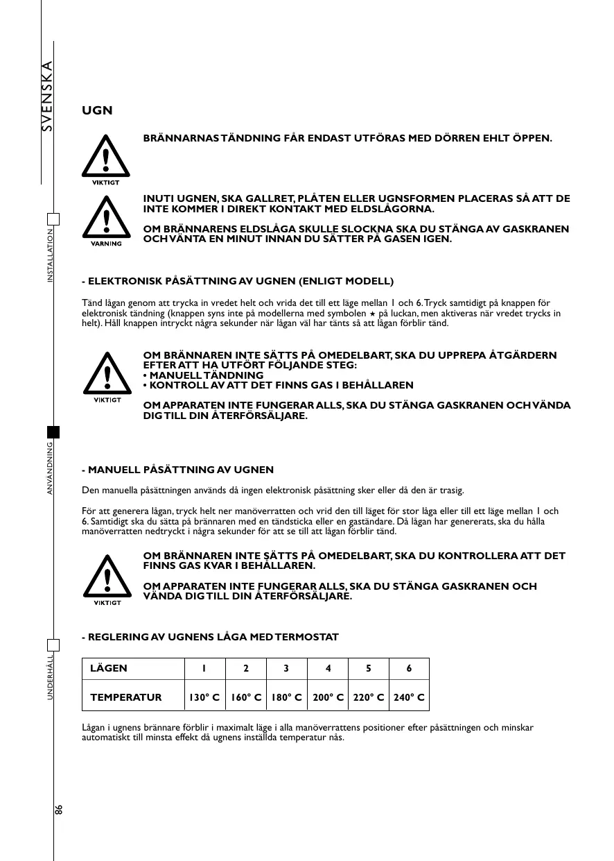 MODELL SVENSK A UGN BRÄNNARNAS TÄNDNING FÅR ENDAST UTFÖRAS MED DÖRREN EHLT ÖPPEN. INSTALLATION INUTI UGNEN, SKA GALLRET, PLÅTEN ELLER UGNSFORMEN PLACERAS SÅ ATT DE INTE KOMMER I DIREKT KONTAKT MED ELDSLÅGORNA. OM BRÄNNARENS ELDSLÅGA SKULLE SLOCKNA SKA DU STÄNGA AV GASKRANEN OCH VÄNTA EN MINUT INNAN DU SÄTTER PÅ GASEN IGEN. - ELEKTRONISK PÅSÄTTNING AV UGNEN (ENLIGT MODELL) Tänd lågan genom att trycka in vredet helt och vrida det till ett läge mellan 1 och 6. Tryck samtidigt på knappen för elektronisk tändning (knappen syns inte på modellerna med symbolen ★ på luckan, men aktiveras när vredet trycks in helt). Håll knappen intryckt några sekunder när lågan väl har tänts så att lågan förblir tänd. OM BRÄNNAREN INTE SÄTTS PÅ OMEDELBART, SKA DU UPPREPA ÅTGÄRDERN EFTER ATT HA UTFÖRT FÖLJANDE STEG: