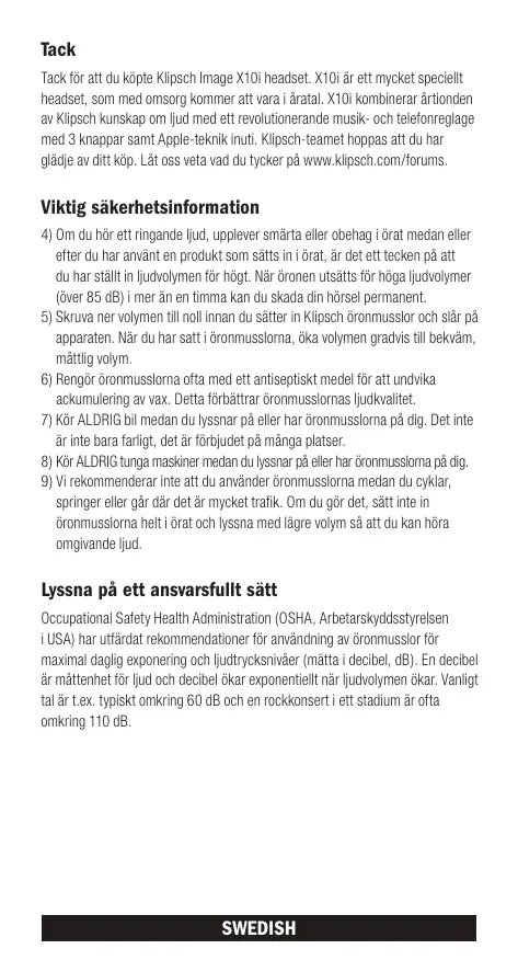 Viktig säkerhetsinformation 4) Om du hör ett ringande ljud, upplever smärta eller obehag i örat medan eller efter du har använt en produkt som sätts in i örat, är det ett tecken på att du har ställt in ljudvolymen för högt. När öronen utsätts för höga ljudvolymer (över 85 dB) i mer än en timma kan du skada din hörsel permanent. 5) Skruva ner volymen till noll innan du sätter in Klipsch öronmusslor och slår på apparaten. När du har satt i öronmusslorna, öka volymen gradvis till bekväm, måttlig volym. 6) Rengör öronmusslorna ofta med ett antiseptiskt medel för att undvika ackumulering av vax. Detta förbättrar öronmusslornas ljudkvalitet. 7) Kör ALDRIG bil medan du lyssnar på eller har öronmusslorna på dig. Det inte är inte bara farligt, det är förbjudet på många platser. 8) Kör ALDRIG tunga maskiner medan du lyssnar på eller har öronmusslorna på dig. 9) Vi rekommenderar inte att du använder öronmusslorna medan du cyklar, springer eller går där det är mycket trafik. Om du gör det, sätt inte in öronmusslorna helt i örat och lyssna med lägre volym så att du kan höra omgivande ljud.