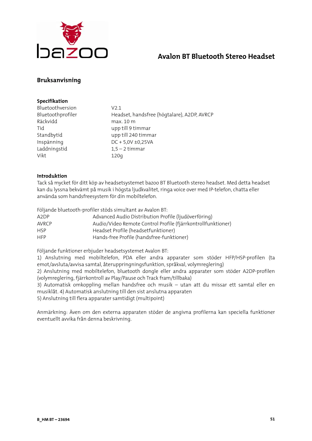 Tack sá mycket für ditt köp av headsetsystemet bazoo BT Bluetooth stereo headset. Med detta headset kan du lyssna bekvämt på musik i högsta ljudkvalitet, ringa voce over med IP-telefon, chatta eller använda som handsfreesystem für din mobiltelefon.