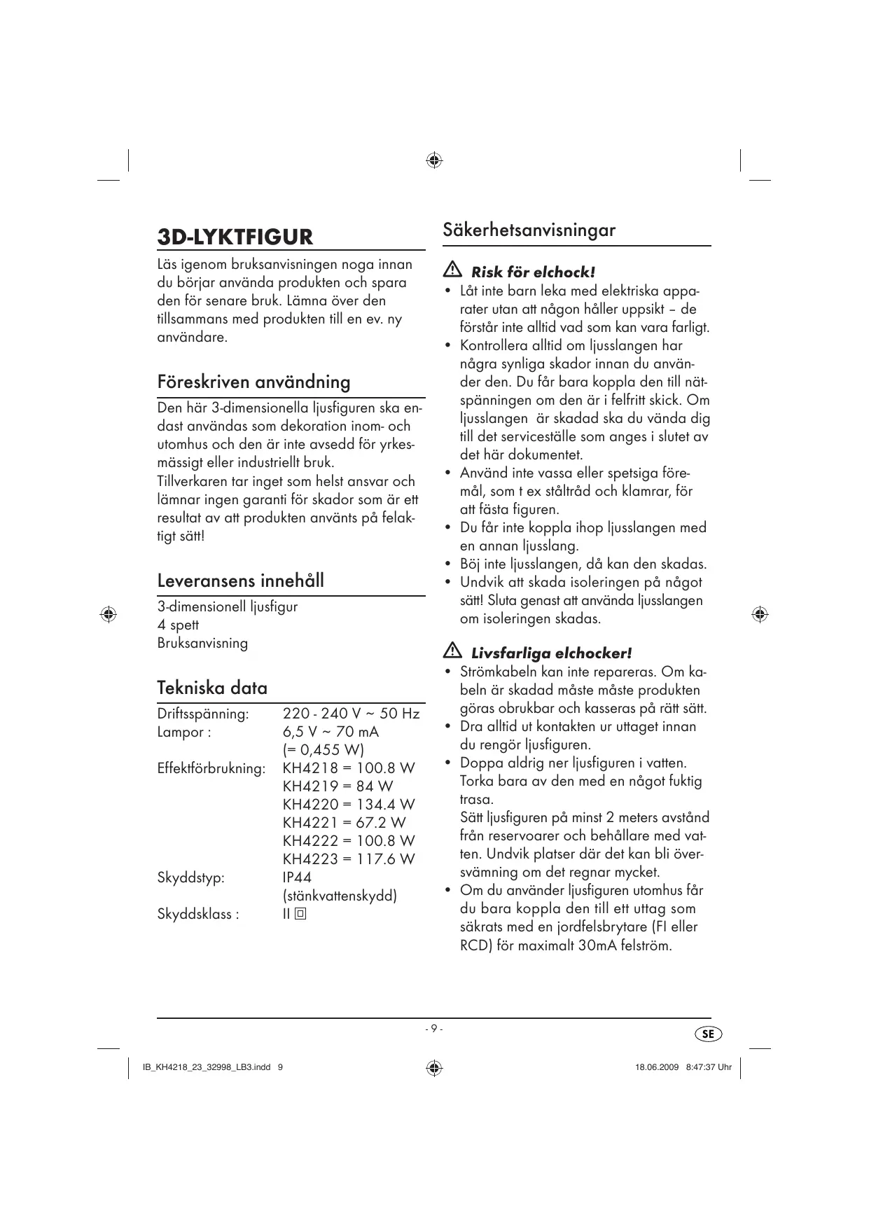 Säkerhetsanvisningar Läs igenom bruksanvisningen noga innan du bërjar använda produkten och spara den fôr senare bruk. Lämna ver den tillsammans med produkten till en ev. ny användare. Fôreskriven användning À Risk fr elchock! Den här 3-dimensionella ljusfiguren ska en- dast användas som dekoration inom- och utomhus och den är inte avsedd für yrkes- mässigt eller industriellt bruk. Tillverkaren tar inget som helst ansvar och lämnar ingen garanti fôr skador som är ett resultat av att produkten använis pà felak- tigt sättl Leveransens innehäll 3-dimensionell ljusfigur 4 spett Bruksanvisning Tekniska data + _Lätinte barn leka med elektriska appa- rater utan att nägon häller uppsikt - de fôrstär inte alltid vad som kan vara farligt. Kontrollera alltid om ljusslangen har nägra synliga skador innan du använ. der den. Du fär bara koppla den till nät- spänningen om den är i felfritt skick. Om ljiusslangen är skadad ska du vända dig till det serviceställe som anges i slutet av det här dokumentet. + Använd inte vassa eller spetsiga fôre- mäl, som t ex stälträd och klamrar, fôr att fästa figuren. Du fär inte koppla ihop ljusslangen med en annan liusslang. Bôj inte ljusslangen, dä kan den skadas. + Undvik att skada isoleringen pà nägot sätt! Sluta genast ait använda ljusslangen om isoleringen skadas. À Livsfarliga elchocker! Driftsspänning: 220-240 V - 50 Hz Lampor : 6,5V -70 mA (= 0,455 W) Effektfôrbrukning: KH4218 = 100.8 W KH4219=84W KH4220 = 1344W KH422 672W KH4222 = 100.8 W KH4223 =1176W Skyddstyp: IP44 (stänkvattenskydd) Skyddsklass : Re + Strômkabeln kan inte repareras. Om ka- beln är skadad mäste mäste produkten gôras obrukbar och kasseras pà rätt sätt. Dra alltid ut kontakten ur uttaget innan du rengôr liusfiguren. + Doppa aldrig ner ljusfiguren i vatten. Torka bara av den med en nägot fuktig trasa. Sätt ljusfiguren pà minst 2 meters avständ frän reservoarer och behällare med vat- ten. Undvik platser där det kan bli ôver- svämning om det regnar mycket. + Om du använder ljusfiguren utomhus fär du bara koppla den till ett uttag som säkrats med en jordfelsbrytare (FI eller RCD) fôr maximalt 30mA felstrôm. IB_KH4218_23 82098 LB3.indd 9