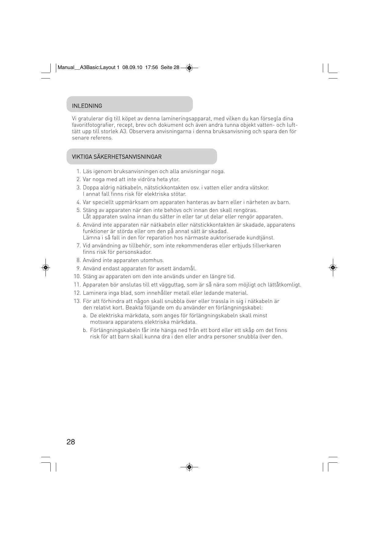 Manual__A3Basic:Layout 1 08.09.10 17:56 Seite 28 INLEDNING Vi gratulerar dig till köpet av denna lamineringsapparat, med vilken du kan försegla dina favoritfotografier, recept, brev och dokument och även andra tunna objekt vatten- och lufttätt upp till storlek A3. Observera anvisningarna i denna bruksanvisning och spara den för senare referens.