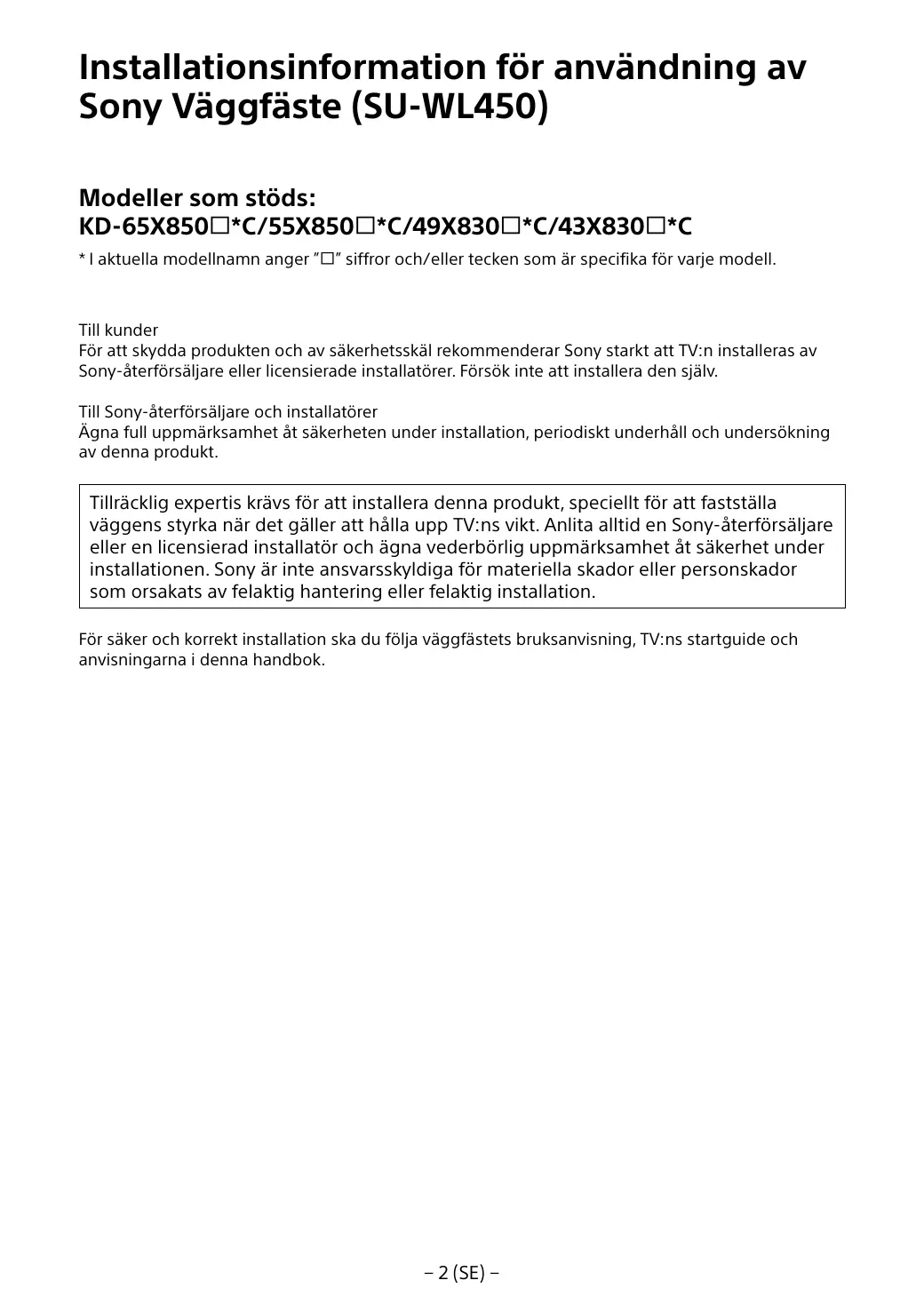 Tillräcklig expertis krävs för att installera denna produkt, speciellt för att fastställa väggens styrka när det gäller att hålla upp TV:ns vikt. Anlita alltid en Sony-återförsäljare eller en licensierad installatör och ägna vederbörlig uppmärksamhet åt säkerhet under installationen. Sony är inte ansvarsskyldiga för materiella skador eller personskador som orsakats av felaktig hantering eller felaktig installation. För säker och korrekt installation ska du följa väggfästets bruksanvisning, TV:ns startguide och anvisningarna i denna handbok.