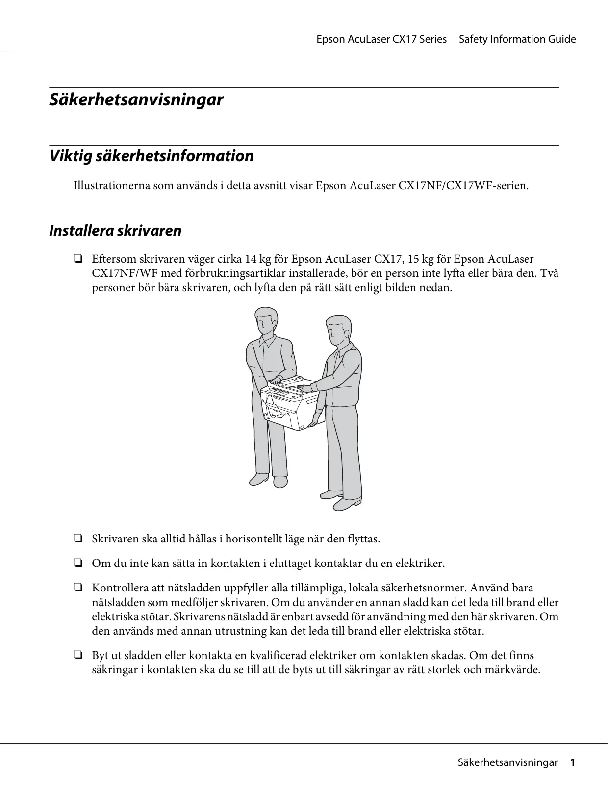 Q Eftersom skrivaren väger cirka 14 kg fôr Epson AcuLaser CX17, 15 kg fôr Epson AcuLaser CX17NF/WF med fôrbrukningsartiklar installerade, bôr en person inte lyfta eller bära den. Tvä personer bôr bära skrivaren, och lyfta den pà rätt sätt enligt bilden nedan.