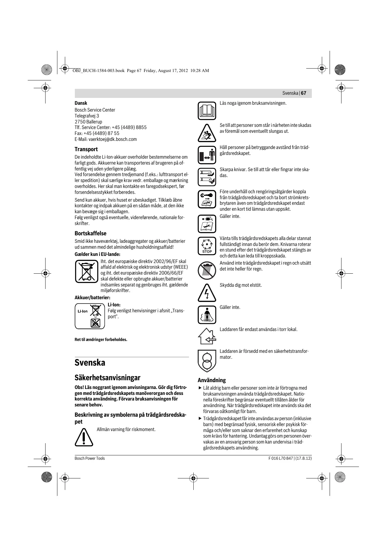 Driftstart För din säkerhet f Obs! Före underhåll och rengöringsåtgärder koppla från trädgårdsredskapet, ta loss strömkretsbrytaren och bort batteriet. Detta gäller även för skadad, snittad eller tilltrasslad nätsladd. f Efter frånkoppling av trädgårdsredskapet rör sig knivarna ännu några sekunder. f Varning – berör inte den roterande kniven. Robert Bosch GmbH, Power Tools Division D-70745 Leinfelden-Echterdingen