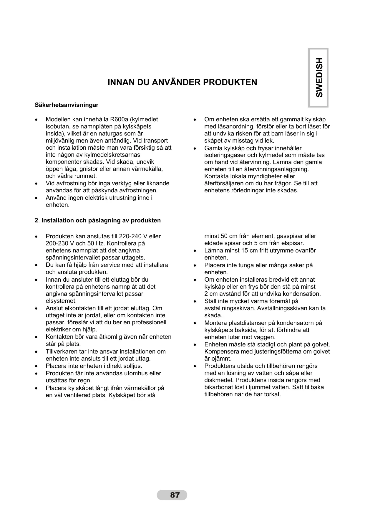 - Modellen kan innehälla R600a (kylmedlet isobutan, se namnpläten på kylskapets insida), vilket är en naturgas som är miljövänlig men även antändlig. Vid transport och installation måste man vara försiktig sä att inte nagon av kylmedelskretarnas componententer skadas. Vid skada, undvik öppen laga, gnistor eller annan värmekälla, och vädra rummet.