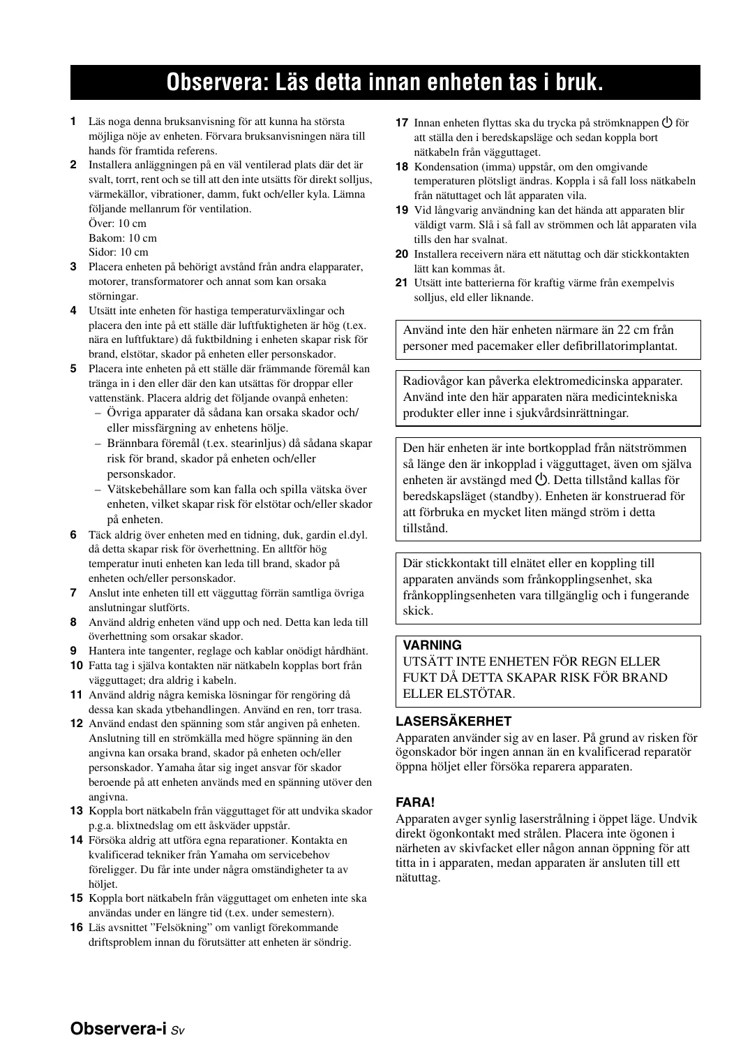 Använd inte den här enheten närmare än 22 cm från personer med pacemaker eller defibrillatorimplantat. Radiovågor kan påverka elektromedicinska apparater. Använd inte den här apparaten nära medicintekniska produkter eller inne i sjukvårdsinrättningar. Den här enheten är inte bortkopplad från nätströmmen så länge den är inkopplad i vägguttaget, även om själva enheten är avstängd med p. Detta tillstånd kallas för beredskapsläget (standby). Enheten är konstruerad för att förbruka en mycket liten mängd ström i detta tillstånd. Där stickkontakt till elnätet eller en koppling till apparaten används som frånkopplingsenhet, ska frånkopplingsenheten vara tillgänglig och i fungerande skick. VARNING UTSÄTT INTE ENHETEN FÖR REGN ELLER FUKT DÅ DETTA SKAPAR RISK FÖR BRAND ELLER ELSTÖTAR. LASERSÄKERHET Apparaten använder sig av en laser. På grund av risken för ögonskador bör ingen annan än en kvalificerad reparatör öppna höljet eller försöka reparera apparaten. FARA! Apparaten avger synlig laserstrålning i öppet läge. Undvik direkt ögonkontakt med strålen. Placera inte ögonen i närheten av skivfacket eller någon annan öppning för att titta in i apparaten, medan apparaten är ansluten till ett nätuttag.