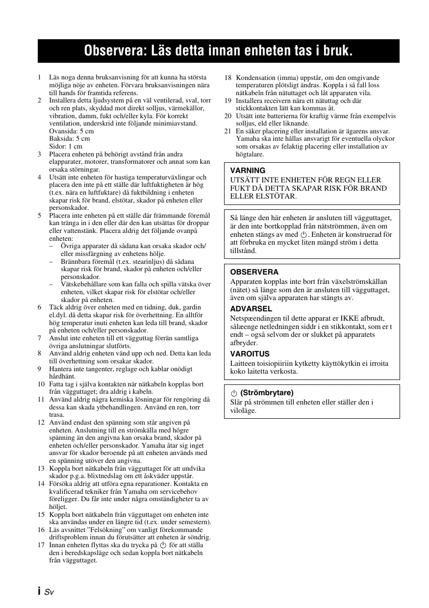 18 La condensación se formará cuando cambie de repente la temperatura ambiental. Desconecte en este caso el cable de alimentación de la toma de corriente y no utilice el aparato. 19 Instale este aparato cerca de la toma de CA y donde se pueda alcanzar fácilmente la clavija de alimentación. 20 Las baterías no deberán exponerse a un calor excesivo como, por ejemplo, el que producen los rayos del sol, el fuego y similares. 21 La colocación o la instalación seguras de la unidad es responsabilidad del propietario. Yamaha no se responsabilizará de ningún accidente provocado por la colocación o instalación incorrecta de los altavoces.