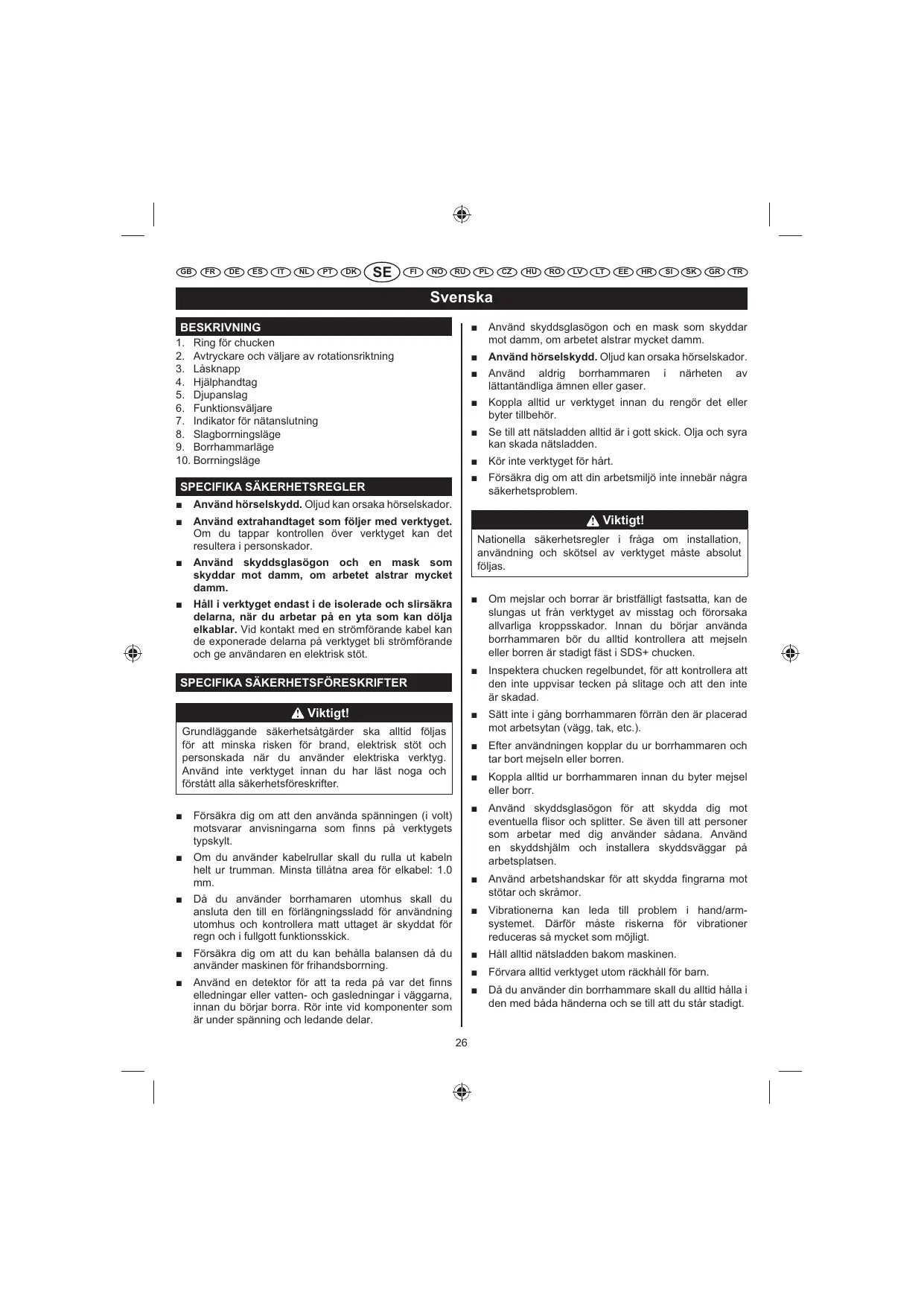 Grundläggande säkerhetsåtgärder ska alltid följas för att minska risken för brand, elektrisk stöt och personskada när du använder elektriska verktyg. Använd inte verktyget innan du har läst noga och förstått alla säkerhetsföreskrifter. Försäkra dig om att den använda spänningen (i volt) motsvarar anvisningarna som finns på verktygets typskylt.