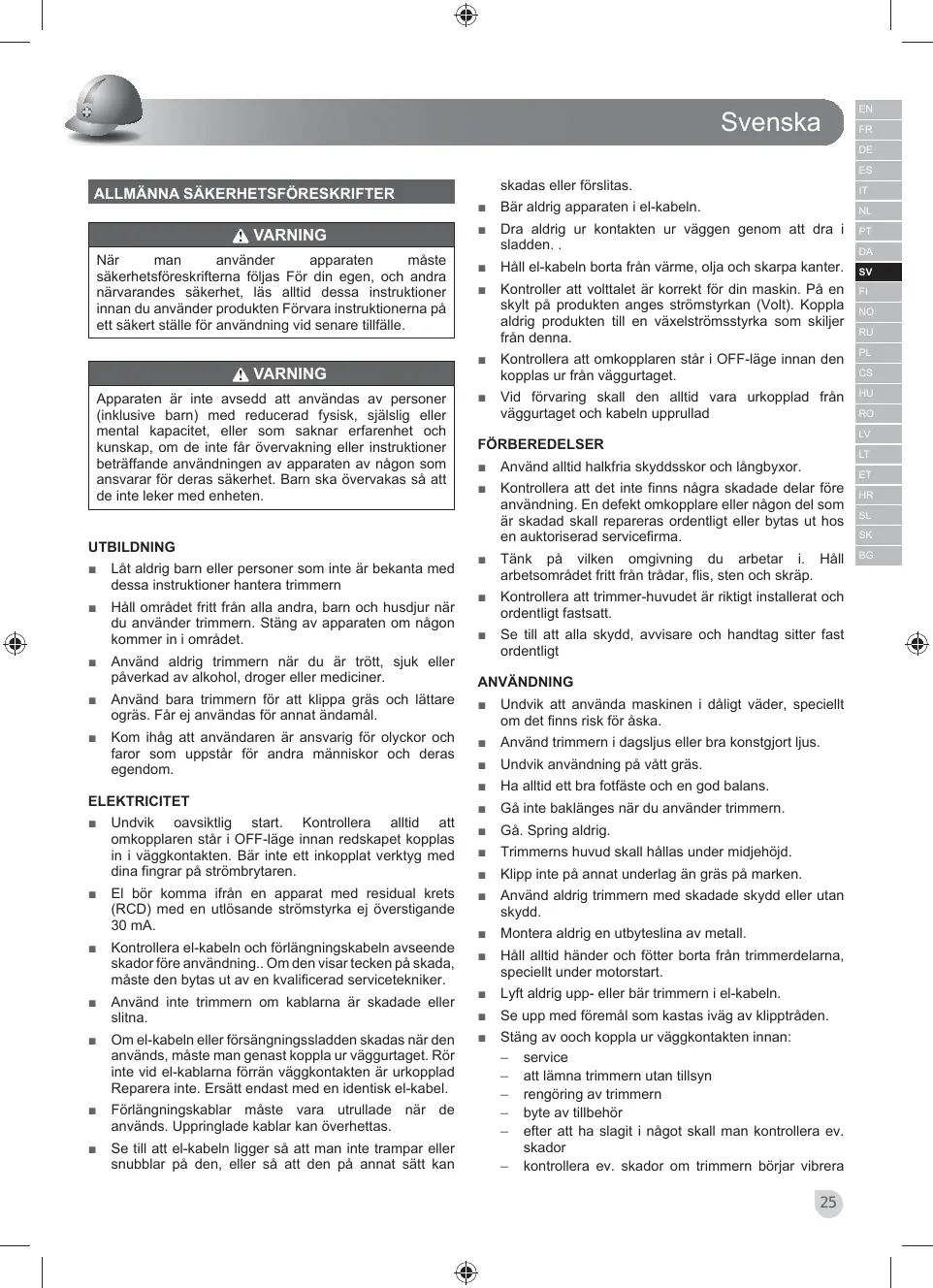 Trimmern är endast konstruerad för att klippa gräs och lättare ogräs i privata trädgårdar. Apparaten får inte användas i allmänna trädgårdar, parker, sportcenter eller på vägrenar och inte heller inom lantbruk eller skogsbruk. Trimmern får inte användas till häckklippning, ansa buskar, blommor eller kompost. Koppla bort kontakten från elnätet direkt före underhåll eller om kabeln skulle vara skadad eller avklippt. Se upp med kringkastade eller flygande föremål. Håll åskådare på säkert avstånd från maskinen. Dubbelisolering