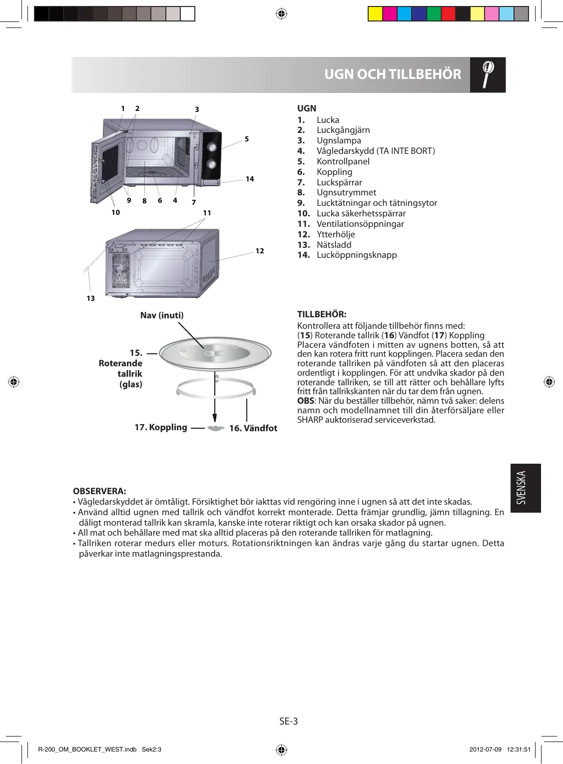 Denna produkt uppfyller kraven i den europeiska standarden EN55011. I överensstämmelse med denna standard, är denna produkt klassificerad som grupp 2 klass B utrustning. Grupp 2 innebär att utrustningen avsiktligen genererar radiofrekvent energi i form av elektromagnetisk strålning för uppvärmningsbehandling av livsmedel. Klass B utrustning innebär att utrustningen är lämplig att användas i hushåll. ** Intern kapacitet beräknas genom att mäta maximal bredd, djup och höjd. Faktisk kapacitet att innehålla mat är mindre. SOM DEL AV EN POLICY FÖR KONTINUERLIG FÖRBÄTTRING FÖRBEHÅLLER VI OSS RÄTTEN ATT ÄNDRA FORMGIVNING OCH SPECIFIKATIONER UTAN FÖRVARNING. SE-2 R-200_OM_BOOKLET_WEST.indb Sek2:2 2012-07-09 12:31:50