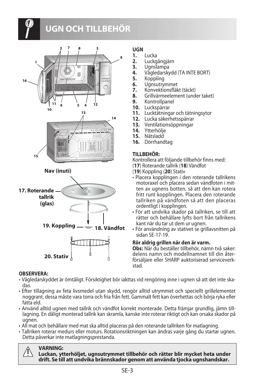 - För användning av stativet se grillavsnitten på sidan SE-17-19. Rör aldrig grillen när den är varm. Obs: När du beställer tillbehör, nämn två saker: delens namn och modellnamnet till din återförsäljare eller SHARP auktoriserad serviceverkstad. OBSERVERA: