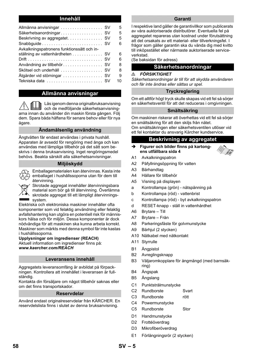 Ilustraciones, véase la contraportada 4 A1 Cartucho de descalcificación A2 Orificio de llenado para agua A3 Asa de transporte A4 Soporte para accesorios A5 Indicación en pantalla a Piloto de control (verde) de tensión de red disponible b Piloto de control (rojo) - Falta de agua c Piloto de control (rojo) - cambiar el cartucho de descalcificación d Tecla de RESET - configurar la dureza del agua A6 Interruptor - ON A7 Interruptor - OFF A8 Soporte de estacionamiento para la boquilla de suelos A9 Ruedas (2 unidades) A10 Cable de conexión a red y enchufe de red A11 Rodillo de dirección B1 Manguera de vapor