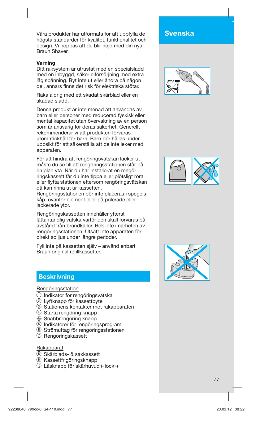 Våra produkter har utformats för att uppfylla de högsta standarder för kvalitet, funktionalitet och design. Vi hoppas att du blir nöjd med din nya Braun Shaver. Varning Ditt raksystem är utrustat med en specialsladd med en inbyggd, säker elförsörjning med extra låg spänning. Byt inte ut eller ändra på någon del, annars finns det risk för elektriska stötar. Svenska STOP Raka aldrig med ett skadat skärblad eller en skadad sladd. Denna produkt är inte menad att användas av barn eller personer med reducerad fyskisk eller mental kapacitet utan övervakning av en person som är ansvarig för deras säkerhet. Generellt rekommenderar vi att produkten förvaras utom räckhåll för barn. Barn bör hållas under uppsikt för att säkerställa att de inte leker med apparaten. För att hindra att rengöringsvätskan läcker ut måste du se till att rengöringsstationen står på en plan yta. När du har installerat en rengöringskassett får du inte tippa eller plötsligt röra eller flytta stationen eftersom rengöringsvätskan då kan rinna ut ur kassetten. Rengöringsstationen bör inte placeras i spegelskåp, ovanför element eller på polerade eller lackerade ytor. Rengöringskassetten innehåller ytterst lättantändlig vätska varför den skall förvaras på avstånd från brandkällor. Rök inte i närheten av rengöringsstationen. Utsätt inte apparaten för direkt solljus under längre perioder. Fyll inte på kassetten själv – använd enbart Braun original refillkassetter. Beskrivning Rengöringsstation 1 Indikator för rengöringsvätska 2 Lyftknapp för kassettbyte 3 Stationens kontakter mot rakapparaten 4 Starta rengöring knapp D Snabbrengöring knapp 5 Indikatorer för rengöringsprogram 6 Strömuttag för rengöringsstationen 7 Rengöringskassett Rakapparat Skärblads- & saxkassett Kassettfrigöringsknapp Låsknapp för skärhuvud («lock»)