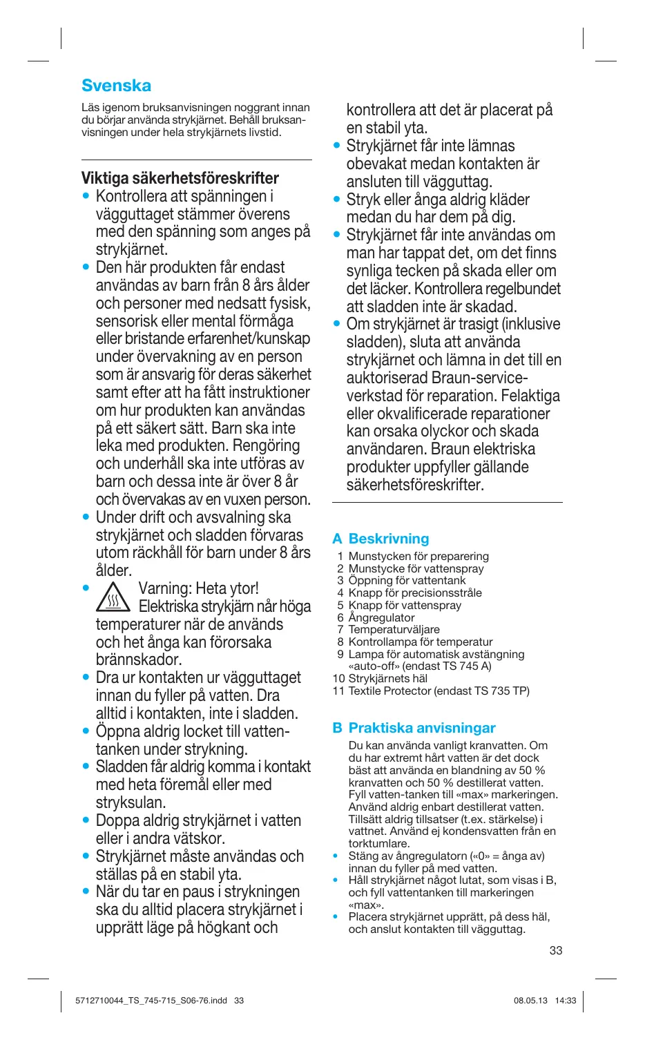 kontrollera att det är placerat på en stabil yta. Strykjärnet får inte lämnas obevakat medan kontakten är ansluten till vägguttag. Stryk eller ånga aldrig kläder medan du har dem på dig. Strykjärnet får inte användas om man har tappat det, om det finns synliga tecken på skada eller om det läcker. Kontrollera regelbundet att sladden inte är skadad. Om strykjärnet är trasigt (inklusive sladden), sluta att använda strykjärnet och lämna in det till en auktoriserad Braun-serviceverkstad för reparation. Felaktiga eller okvalificerade reparationer kan orsaka olyckor och skada användaren. Braun elektriska produkter uppfyller gällande säkerhetsföreskrifter. A Beskrivning