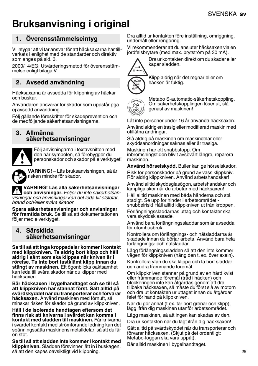 Háll i de isolerade handtagen aftersom det finns risk att knivarna i svärdet kan komma i kontakt med sladden till maskinen. Fár knivarna i svärdet kontakt med strömforande ledning kan det spanningsssätta maskinens metalldeler, SSEATT DU FARN EN STÖT.